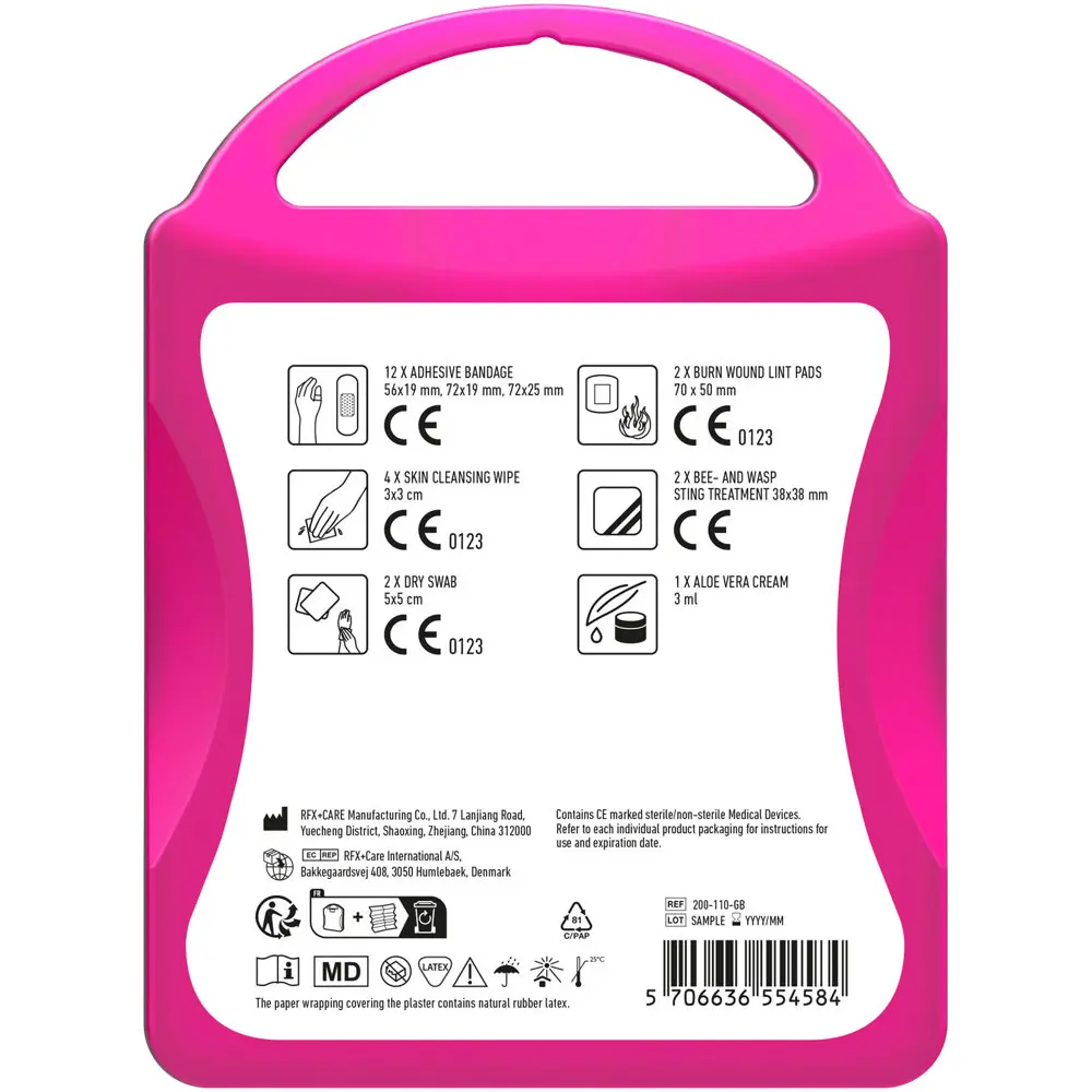 Il contient : 12 pansements adhésifs, 4 cotons imbibés pour nettoyer la peau, 2 cotons secs, 2 compresses pour brûlures et 1 patch spécifique aux piqûres d'abeilles, ainsi qu'une crème apaisante à l'aloe vera. Tous les composants respectent les normes européennes pour une qualité optimale.