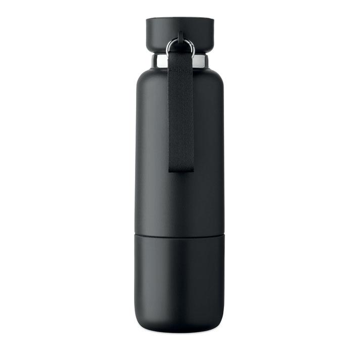 Équipée d'une poignée intégrée et d'une sangle longue de 70 cm fixée au couvercle en PP, elle offre une prise en main confortable et un transport facile. Anti-fuite et livrée avec un gobelet inclus, elle est parfaite pour une utilisation nomade lors de salons, team buildings ou distributions publicitaires.