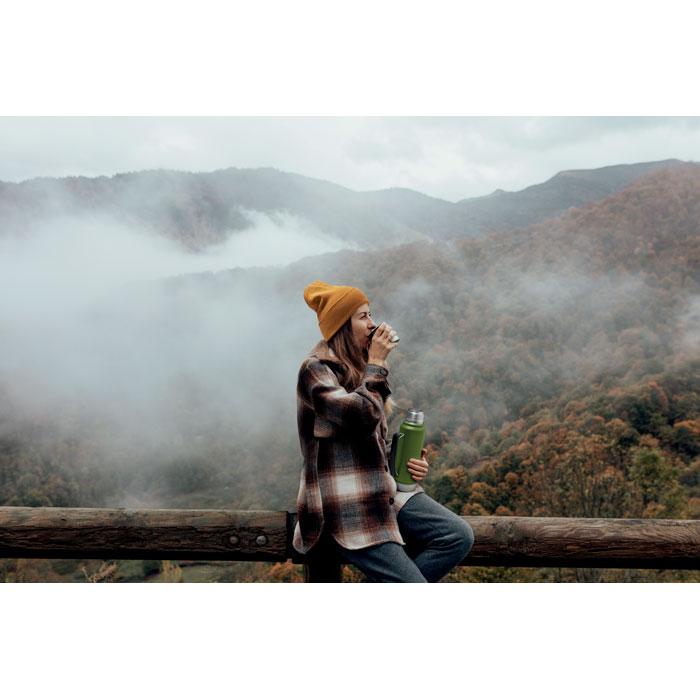 Découvrez cette bouteille isotherme à double paroi en acier inoxydable recyclé (90 % recyclé et 10 % neuf), idéale pour conserver vos boissons chaudes ou froides pendant des heures grâce à son isolation sous vide. Équipée d'une poignée latérale pratique pour un transport facile, d'un couvercle en PP et d'un gobelet intérieur en acier inoxydable recyclé, elle est parfaitement anti-fuite avec une capacité généreuse de 1 litre.