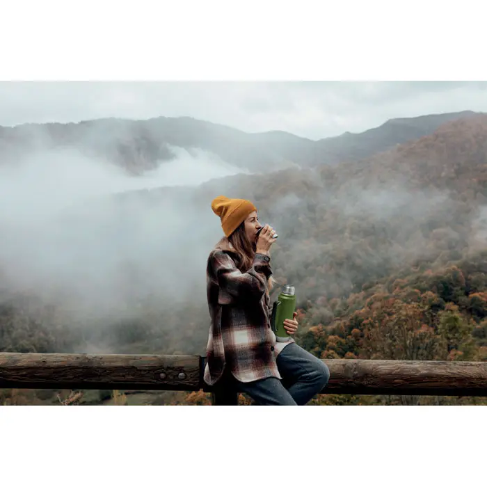 Fabriquée à partir de 90 % d'acier inoxydable recyclé et 10 % d'acier inoxydable neuf, cette bouteille intègre une isolation sous vide pour maintenir la température des boissons pendant des heures. Elle dispose d'une poignée latérale pratique pour un transport facile, un couvercle en PP et un gobelet intérieur en acier inoxydable recyclé. Totalement anti-fuite, elle offre une capacité généreuse de 1 litre, parfaite pour les journées actives.