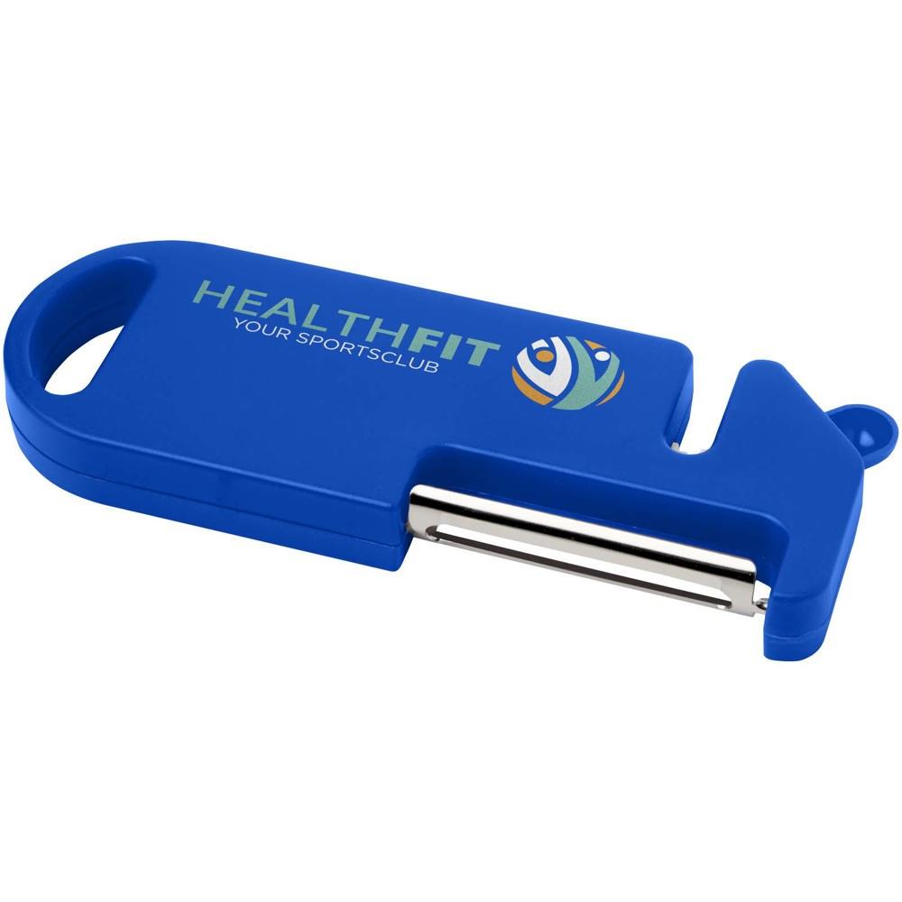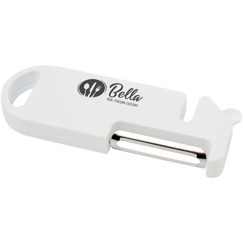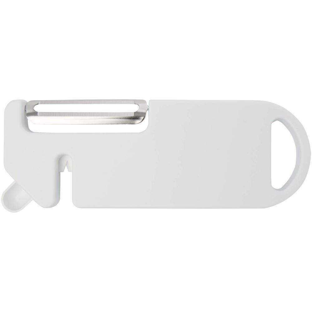 Découvrez cet outil de cuisine polyvalent idéal pour les cadeaux d'entreprise et les objets publicitaires. Fabriqué en plastique recyclé, il intègre quatre fonctions essentielles dans un format compact : un éplucheur précis, un décapsuleur robuste, un aiguiseur de couteaux efficace et un embout pointu pour ôter les yeux des pommes de terre.