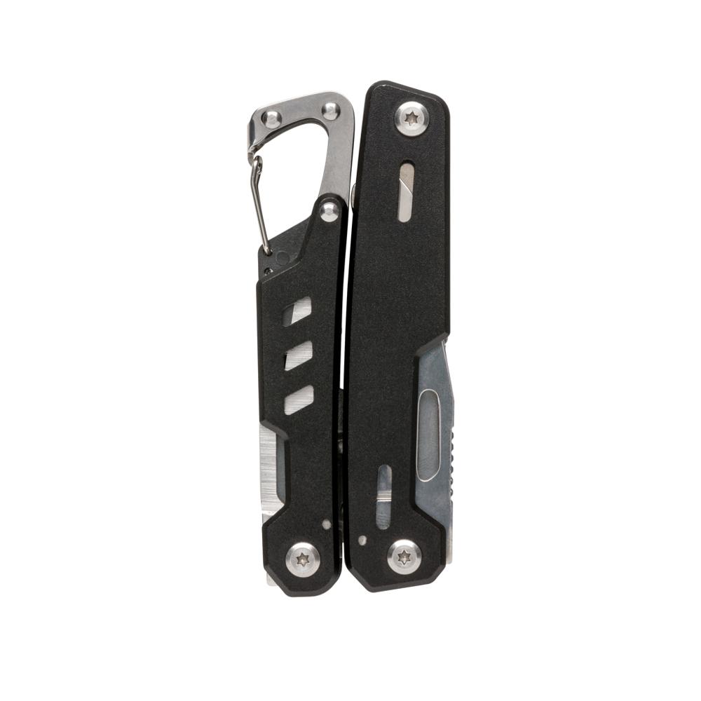 Découvrez cet outil multifonctions en aluminium robuste Cadeaux d'affaires > Promotions & primes > Outils, équipé de 11 fonctions essentielles en acier inoxydable. Parfait pour les professionnels en déplacement, il inclut : pince à bec effilé, pince universelle, pince coupante, couteau tranchant Cadeaux d'affaires > A l'extérieur > Couteaux & canifs, tournevis cruciforme, tournevis plat, scie polyvalente, ouvre-boîte pratique, ouvre-bouteille, décapsuleur et mousqueton pour accrocher facilement, ainsi qu'une pince à dénuder.