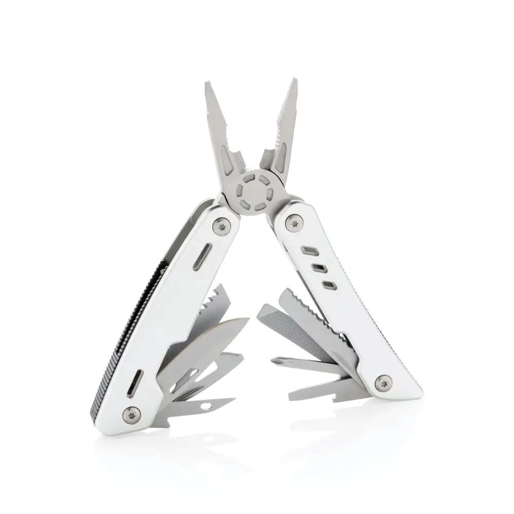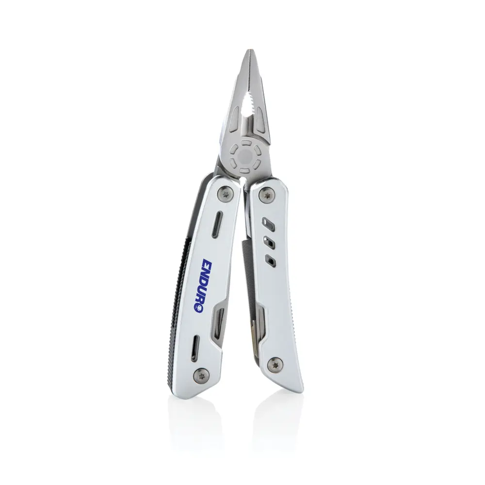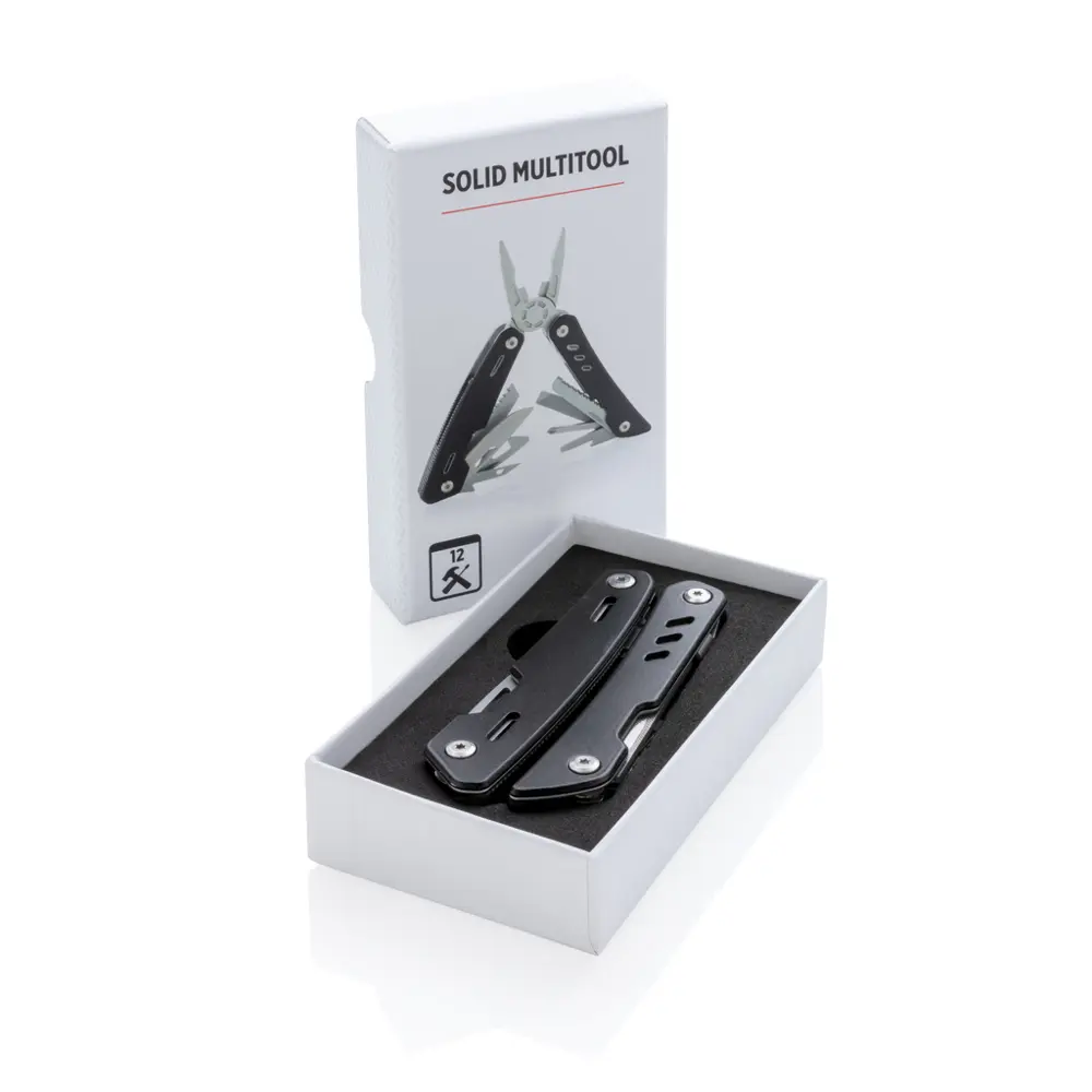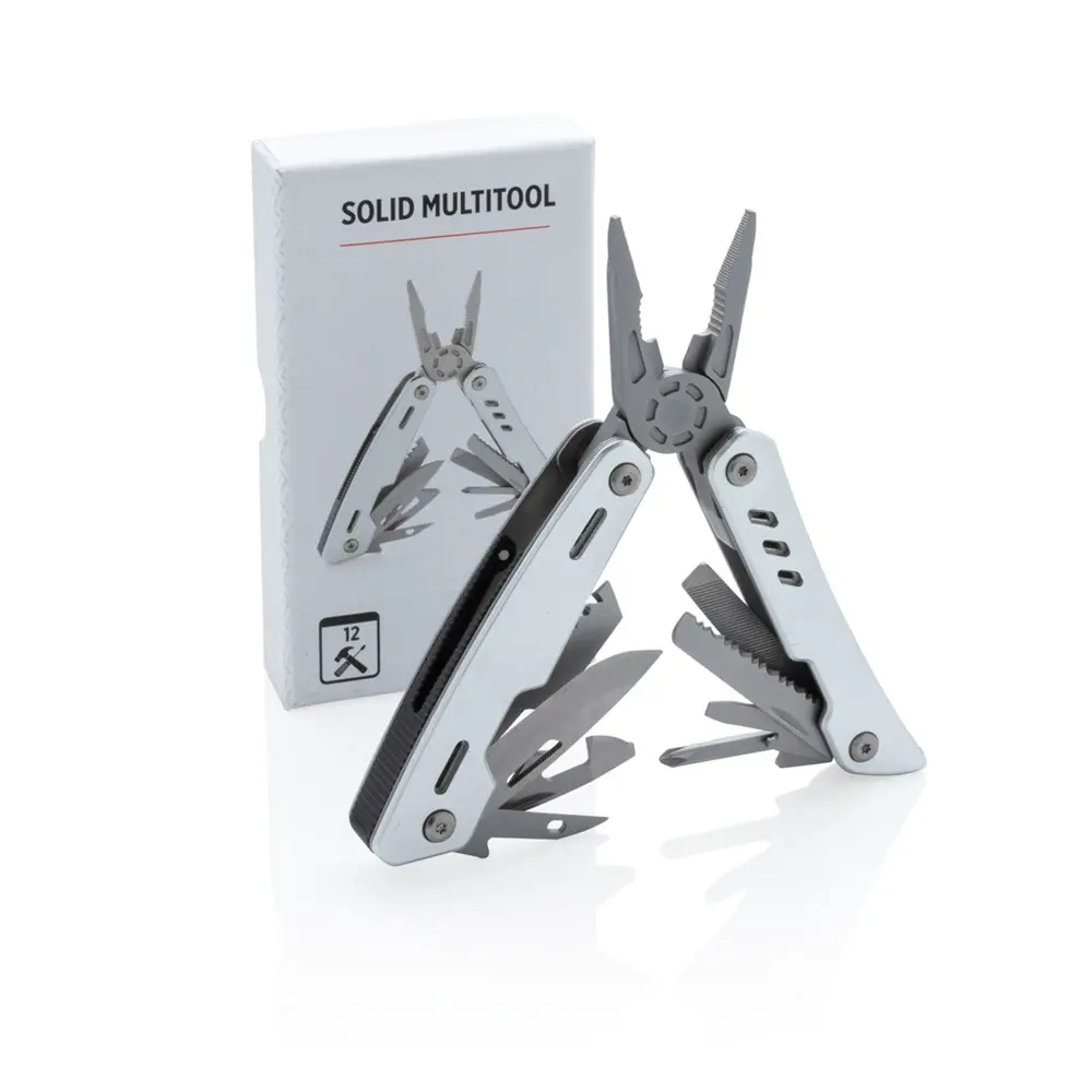 Découvrez l'outil multifonctions Solid, un compagnon idéal pour vos campagnes promotionnelles. Fabriqué en aluminium robuste avec des outils en acier inoxydable, il intègre 12 fonctions essentielles : pince à bec, pince, pince coupante, couteau, tournevis cruciforme, petit tournevis plat, scie, ouvre-boîte, décapsuleur, lame dentelée, poinçon et lime.