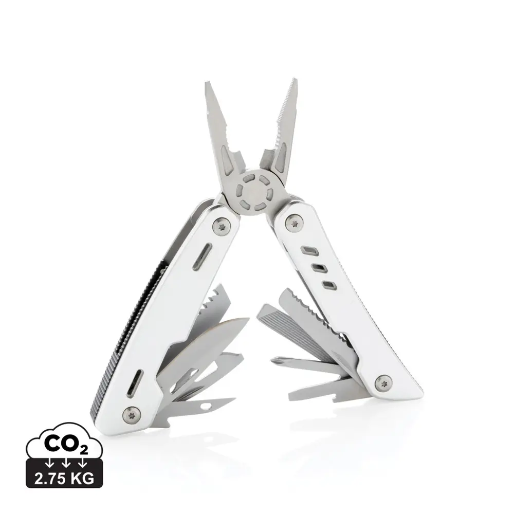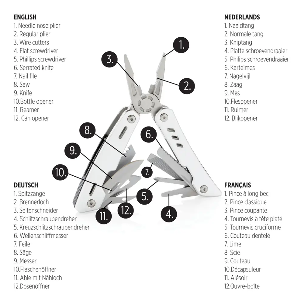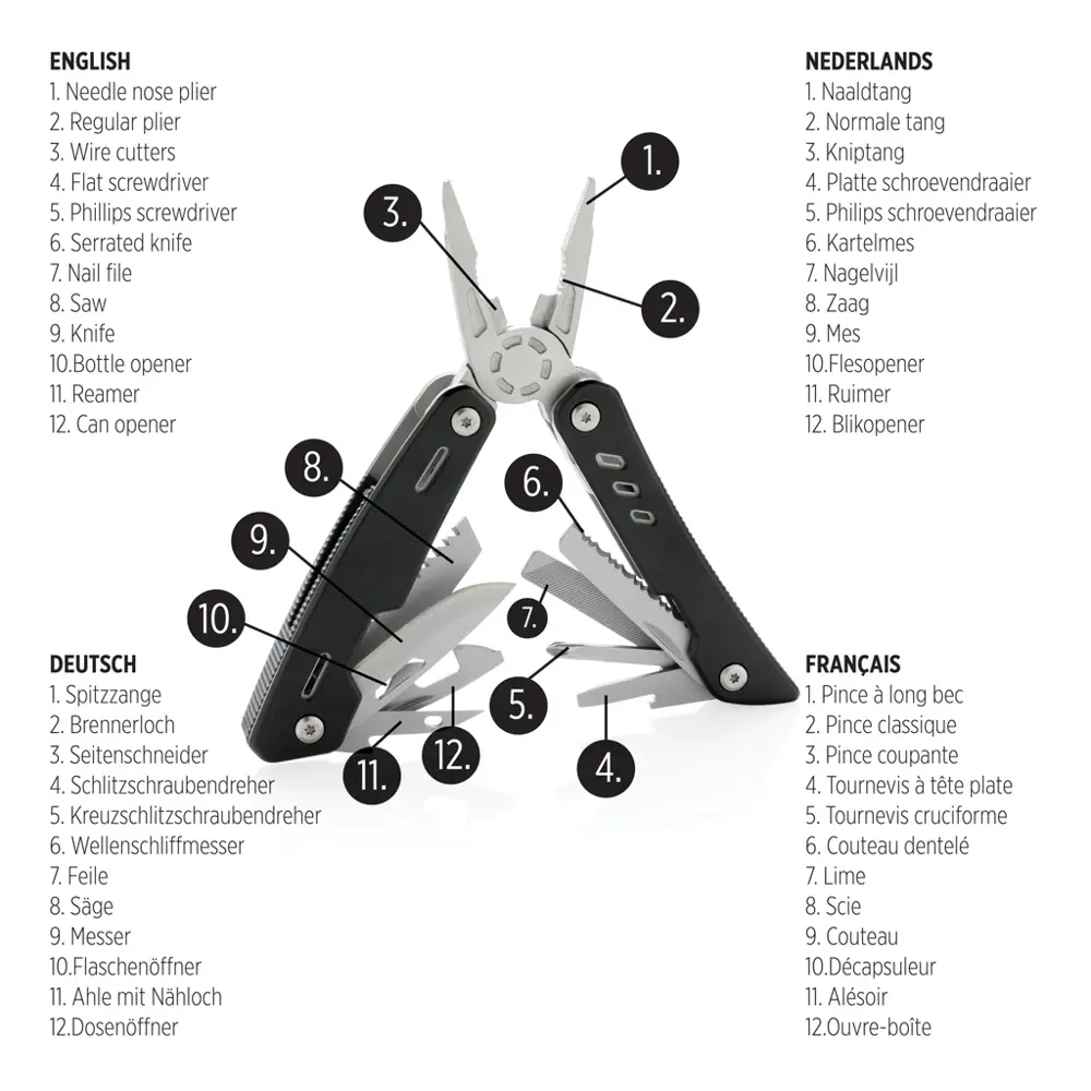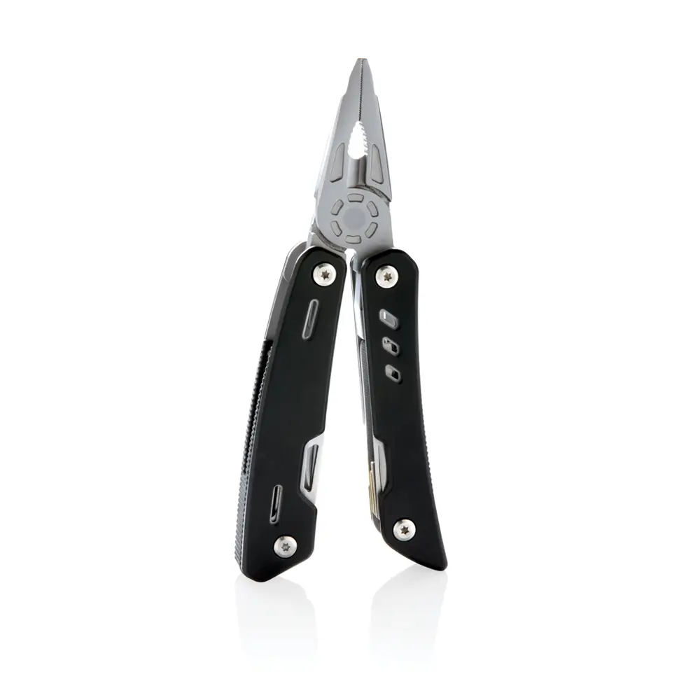 Découvrez l'outil multifonctions Solid, un compagnon idéal pour vos campagnes promotionnelles. Fabriqué en aluminium robuste avec des outils en acier inoxydable, il intègre 12 fonctions essentielles : pince à bec, pince, pince coupante, couteau, tournevis cruciforme, petit tournevis plat, scie, ouvre-boîte, décapsuleur, lame dentelée, poinçon et lime.