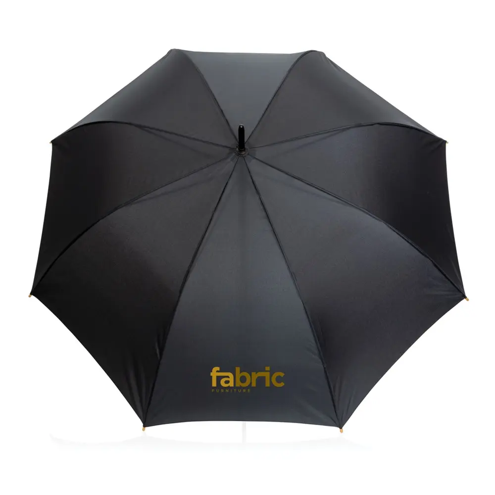 Découvrez le parapluie à ouverture automatique avec poignée en bambou Biba, un outil promotionnel idéal pour vos événements et campagnes marketing. Fabriqué à partir de 10,7 bouteilles PET recyclées, il intègre le traceur AWARE™ pour une traçabilité blockchain authentique, garantissant des matériaux recyclés et une réduction réelle de la consommation d'eau.