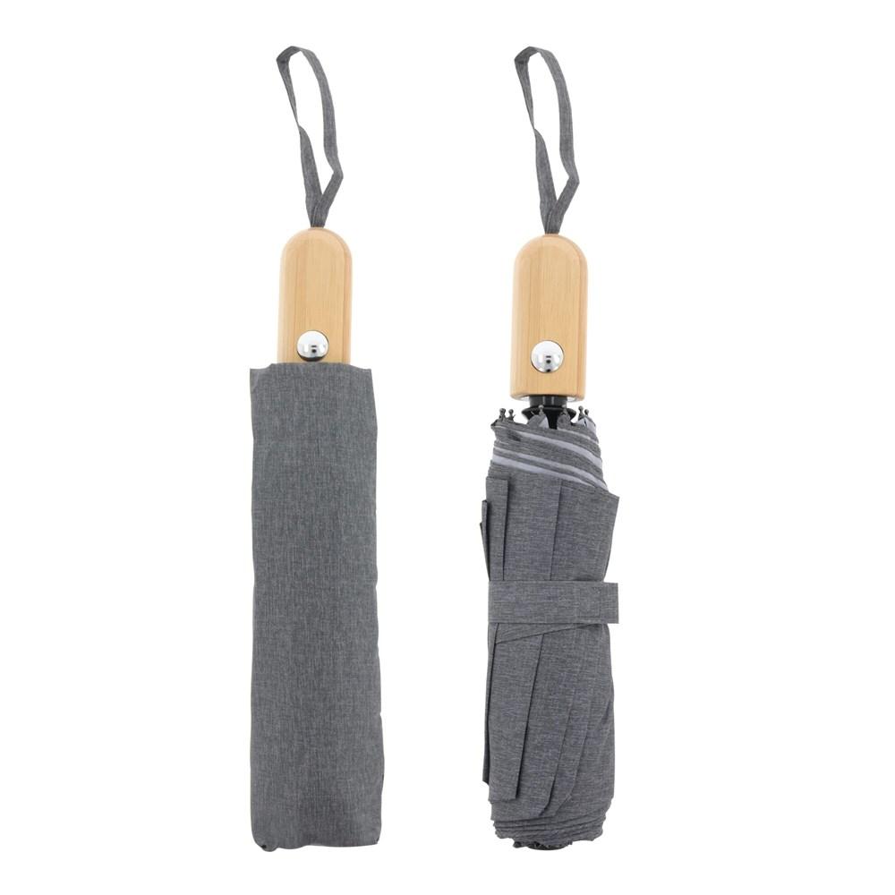 Découvrez notre parapluie pliable 21” à ouverture automatique, un cadeau promotionnel haut de gamme idéal pour vos événements et campagnes marketing. Fabriqué en R-PET recyclé, il allie durabilité écologique et élégance avec sa manche en bois véritable et son design emblématique.