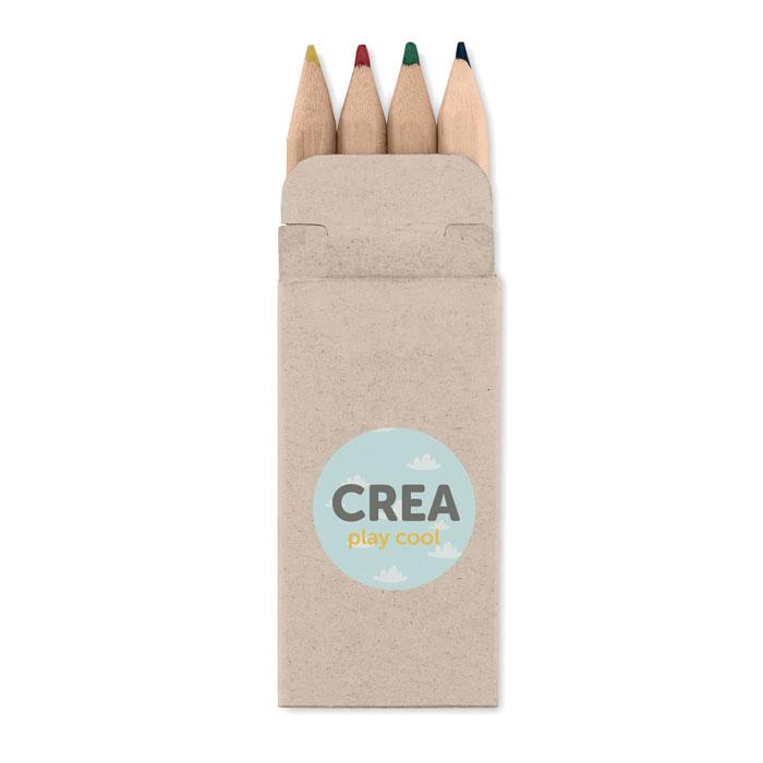 Le PETIT ABIGAIL est l'idéal pour vos campagnes promotionnelles et événements : un set de 4 mini crayons de couleur présenté dans un étui compact en papier recyclé, prêt à être personnalisé avec votre logo.