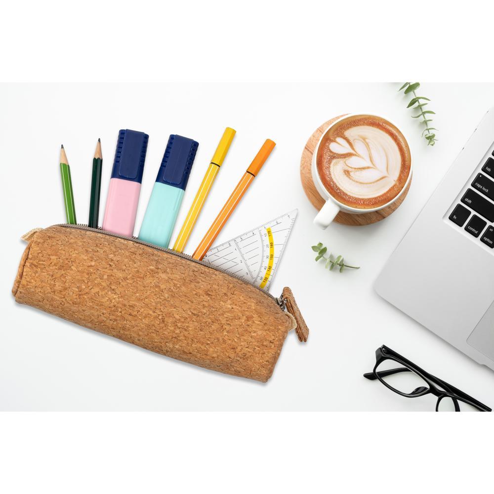 Découvrez cette trousse compacte et élégante, idéale pour ranger de nombreux crayons ou accessoires de bureau. Son design cylindrique en textile intérieur et extérieur en liège offre un rangement organisé et protégé grâce à sa fermeture éclair sécurisée. La dragonne intégrée facilite le transport au quotidien.