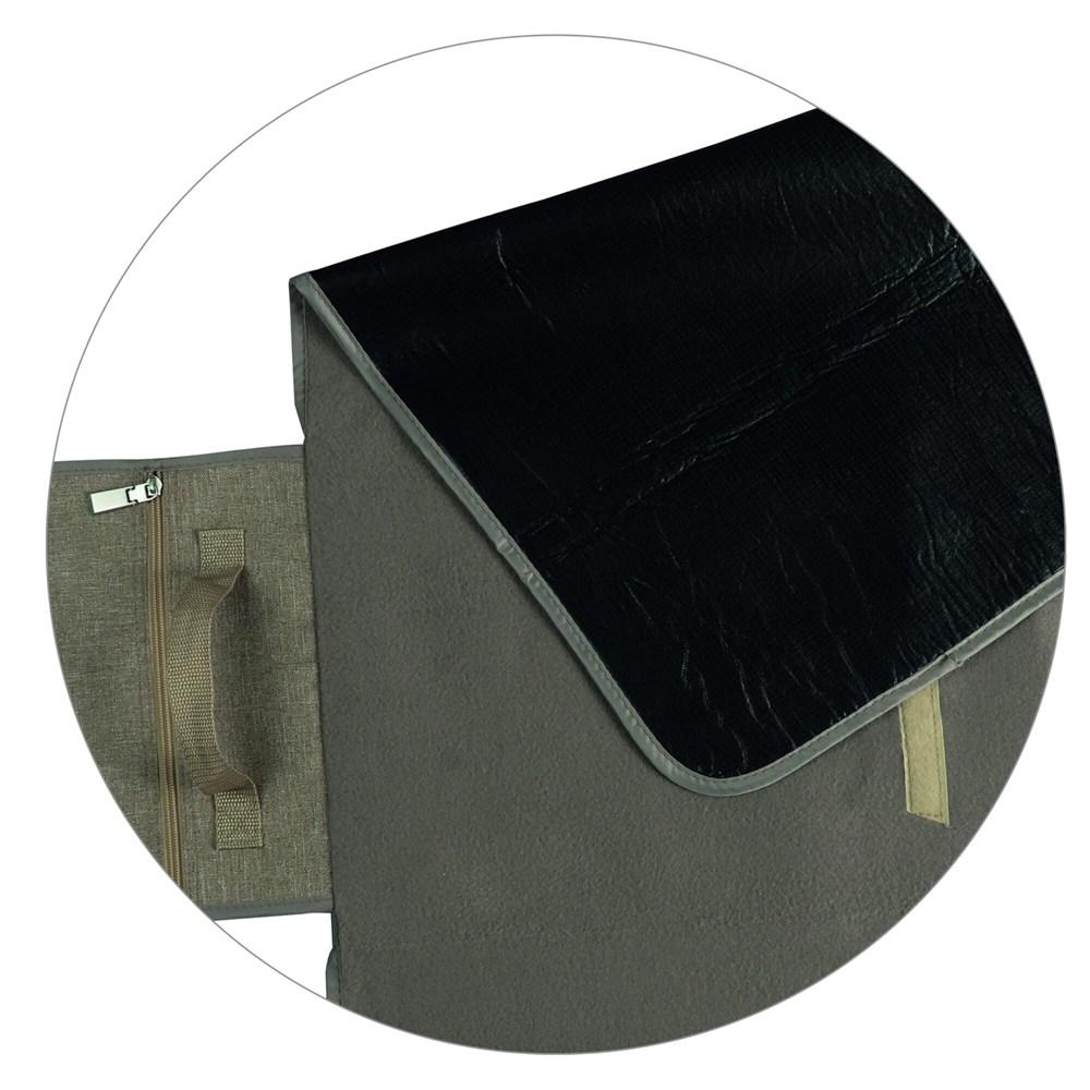 Son envers hydrofuge protège efficacement contre l'humidité, tandis que la poche zippée permet de ranger couverts, serviettes ou petits objets essentiels. La poignée intégrée facilite le transport et le rangement une fois l'événement terminé.