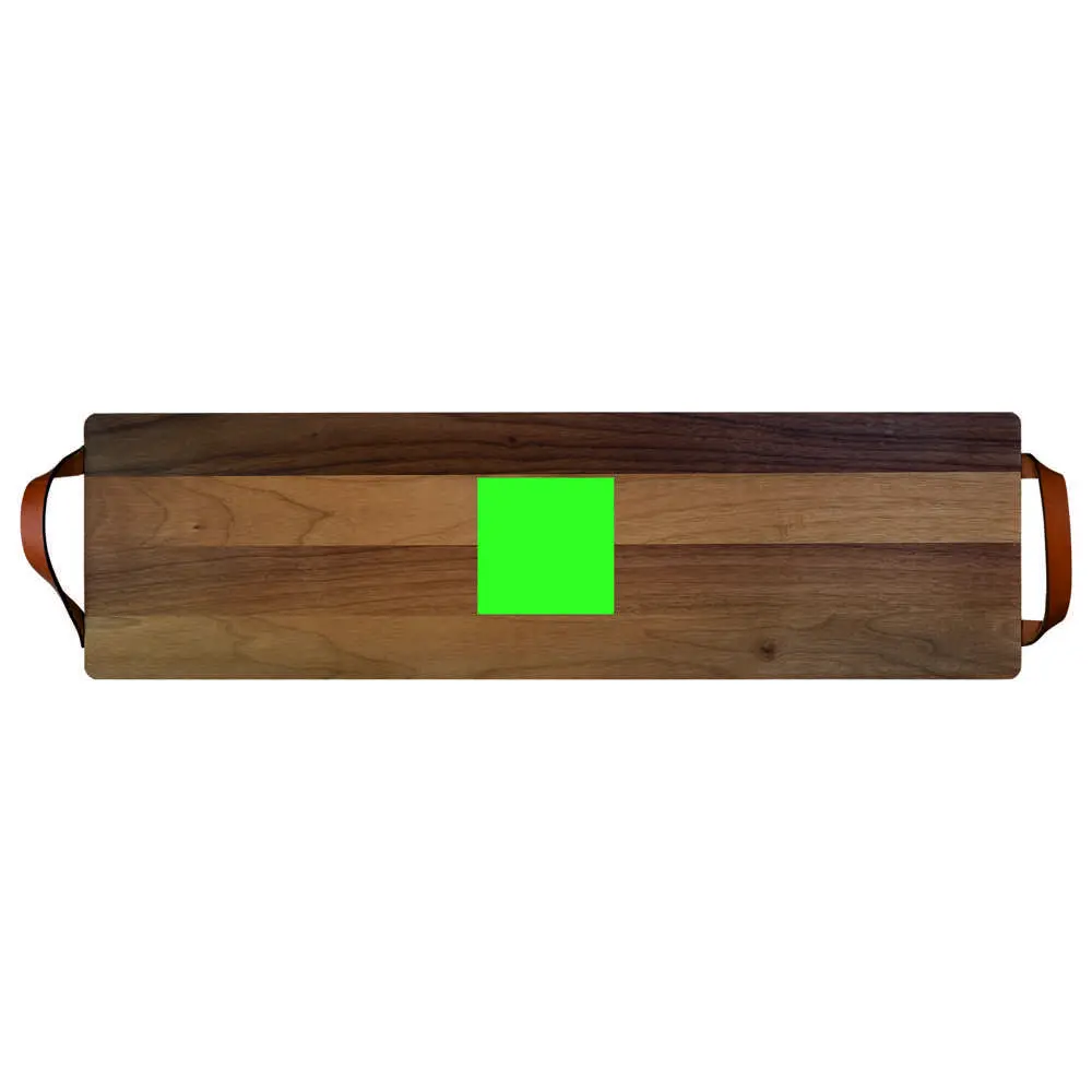 Fabriquée en bois de noyer certifié bio, cette planche garantit une robustesse exceptionnelle pour un usage quotidien ou festif. Les poignées en cuir pleine fleur ajoutent une touche luxueuse, assurant une prise en main confortable et sécurisée. Cette combinaison bois-cuir crée un look intemporel qui s'accorde avec tout type de décoration, que ce soit pour des occasions formelles ou décontractées.