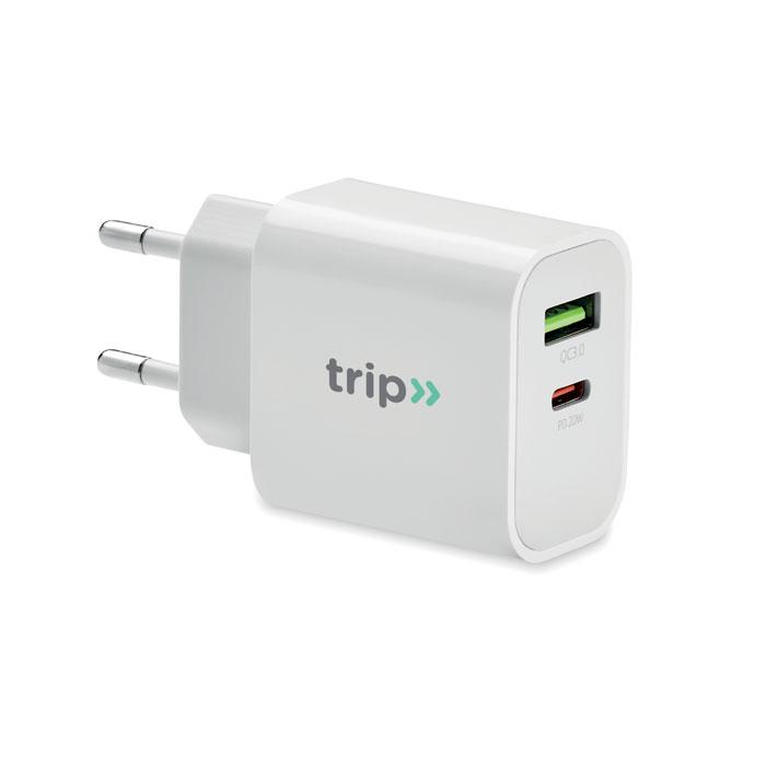 Découvrez notre chargeur 18W 2 ports idéal pour les relation-gifts personnalisés avec impression logo. Ce chargeur européen équipé de sorties USB Type A et Type C offre une charge rapide jusqu'à 18W, compatible Quick Charge 3.0 et Power Delivery.