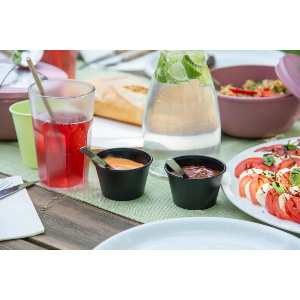 Fabriqué en polypropylène (PP) de haute qualité, ce pot est 100 % recyclable et conforme aux normes BPA-free, garantissant la sécurité pour vos clients. Résistant au lave-vaisselle industriel, il convient aussi bien à un usage privé qu'en restauration. Sa conception empilable facilite le stockage et l'organisation, que ce soit en interne ou lors d'événements.