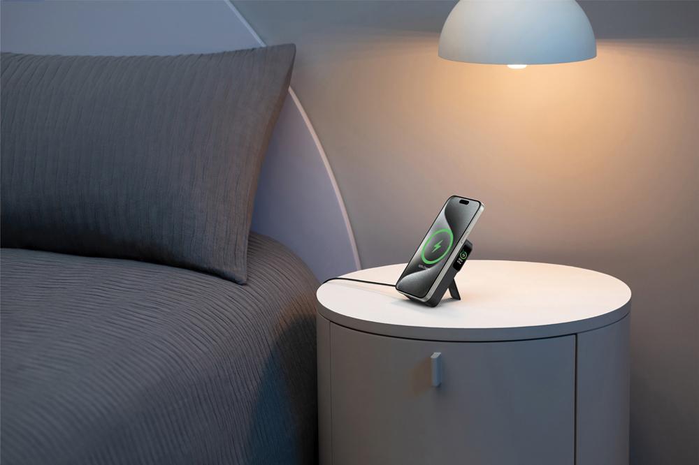 Le support pliable intégré permet un usage mains libres parfait pour les appels vidéo ou le visionnage lors d'événements professionnels. L'écran intelligent affiche en un clin d'œil le niveau de batterie et le statut de charge, tandis que la technologie ActiveShield assure une protection optimale contre les surchauffe.