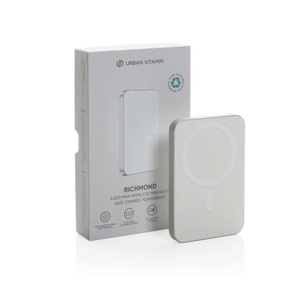 Découvrez la powerbank 5000mAh RCS UrbanVitamin Richmond, idéale pour les entreprises et organisateurs d'événements cherchant des cadeaux promotionnels personnalisables avec logo. Sa technologie magnétique s'accroche facilement à l'iPhone 12 et plus, ainsi qu'aux smartphones Android récents, pour une charge sans fil rapide de 15W. Via son port USB-C, profitez d'une charge filaire ultra-rapide de 20W pour recharger la batterie ou vos appareils en un clin d'œil.