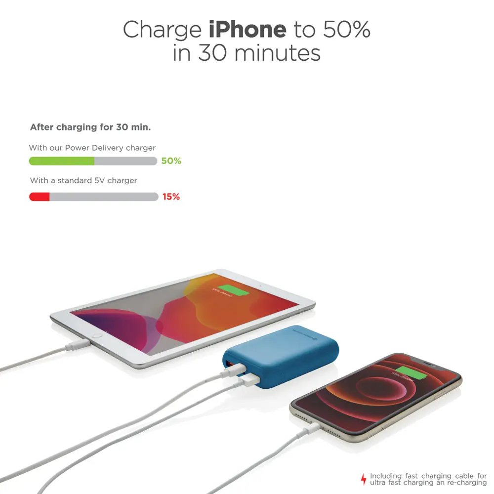 Découvrez cette batterie de secours de 10 000 mAh, idéale pour les professionnels du marketing et les organisateurs d'événements. Elle permet de charger votre smartphone jusqu'à 2,5 fois plus rapidement grâce au port PD Type-C 18W, atteignant 50 % de charge en seulement 30 minutes. Avec ses doubles ports USB-A et Type-C, rechargez simultanément jusqu'à trois appareils, garantissant une connectivité optimale lors de vos manifestations ou campagnes promotionnelles.