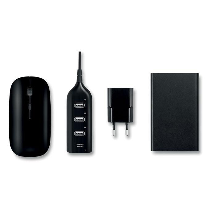 Découvrez le POWERSET, l'ensemble d'accessoires informatiques parfait pour vos campagnes marketing et événements professionnels. Cette pochette EVA/PU compacte contient une souris sans fil, un hub 4 ports USB 2.0, une prise EU et une powerbank 4000 mAh, avec câble de chargement micro USB inclus.
