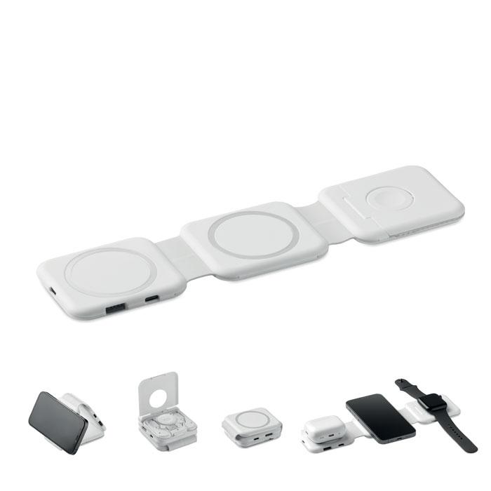 Découvrez le ROIS - Station de charge pliable, une solution de recharge magnétique en ABS ultra-pratique pour vos événements et campagnes marketing. Avec 3 points de charge sans fil (1 x 15W pour smartphones, 1 x 5W pour TWS et 1 x 3W pour Apple Watch), 2 ports Type-C et 2 ports USB-A, elle recharge simultanément plusieurs appareils.