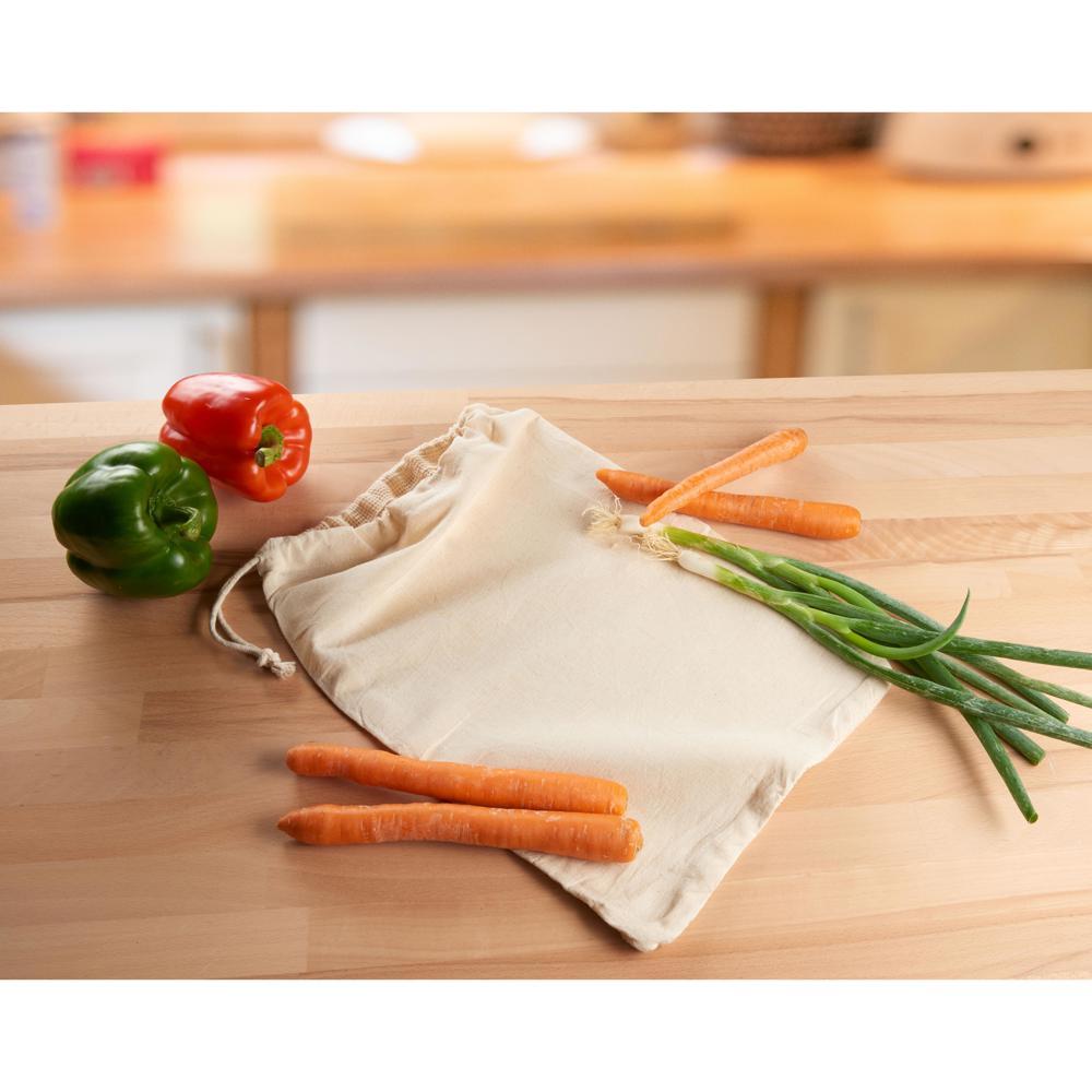Découvrez l'alternative écologique et durable aux sacs plastiques jetables. Ce grand sac innovant combine un côté en 100 % coton solide et un côté en filet de coton respirant, parfait pour transporter fruits et légumes sans les écraser.