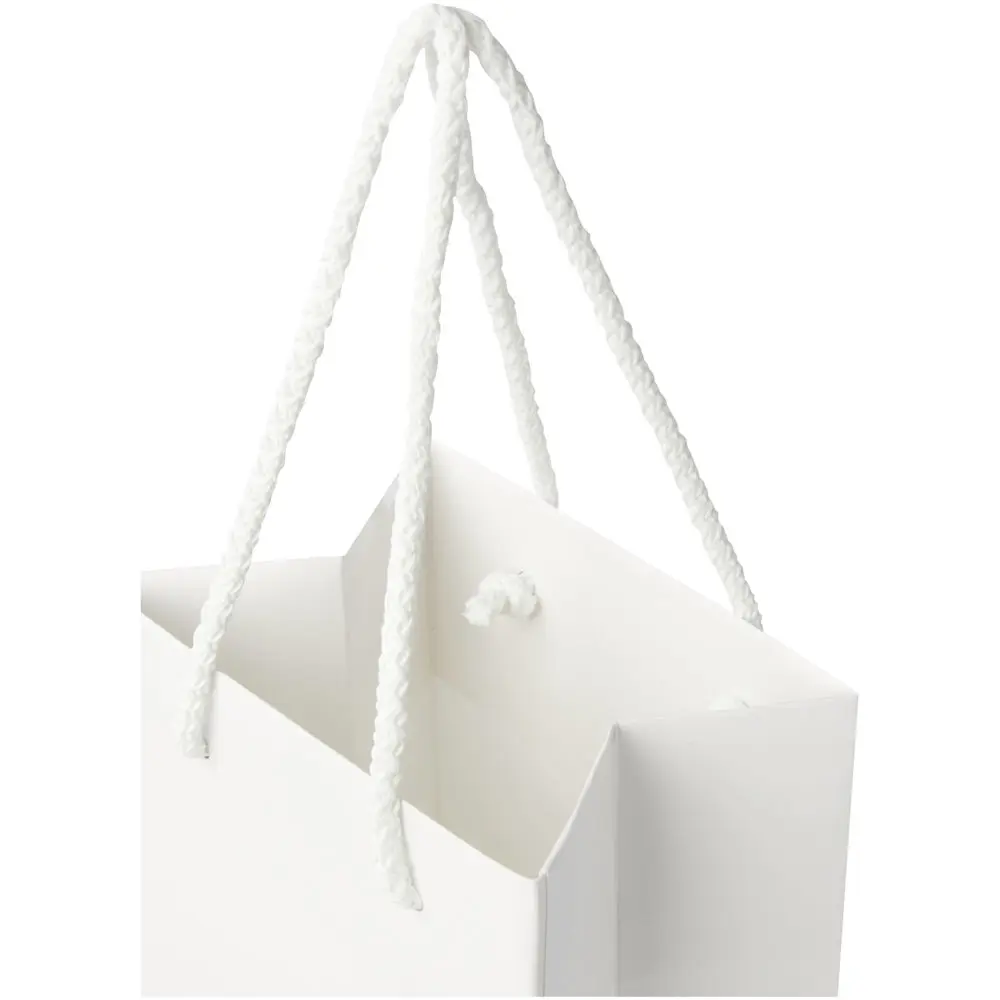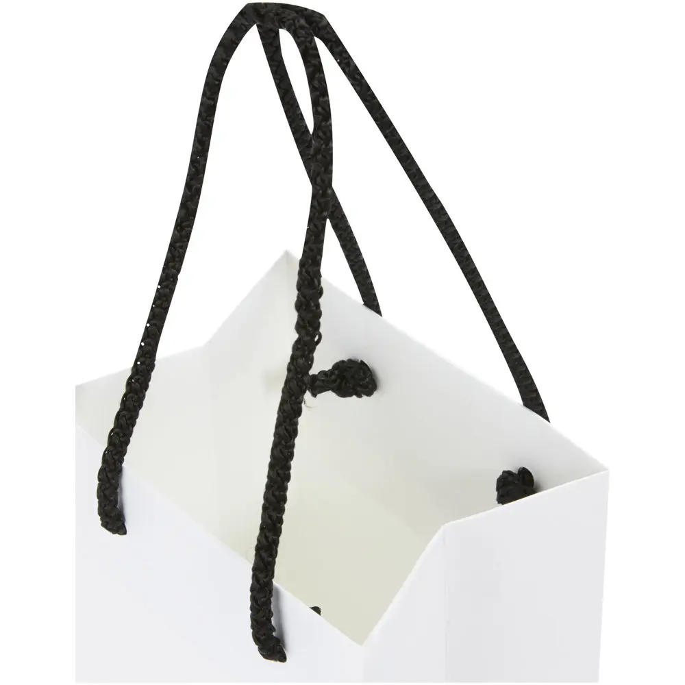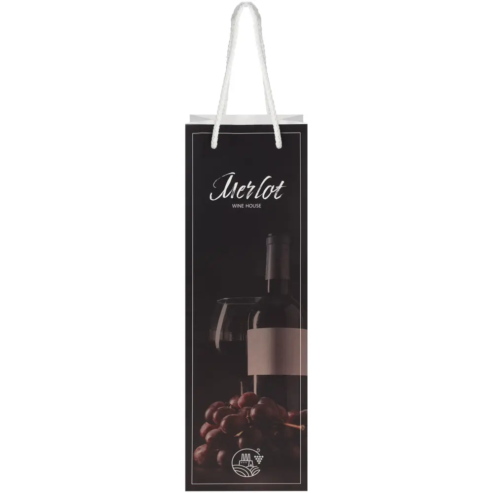 Découvrez notre sac en papier intégré de 170 g/m², mat artisanal, conçu sur mesure pour une bouteille de vin (dimensions : 12 x 9 x 37 cm). Avec ses poignées torsadées en plastique robustes, il offre une tenue confortable et sécurisée pour transporter vos cadeaux ou promotions.