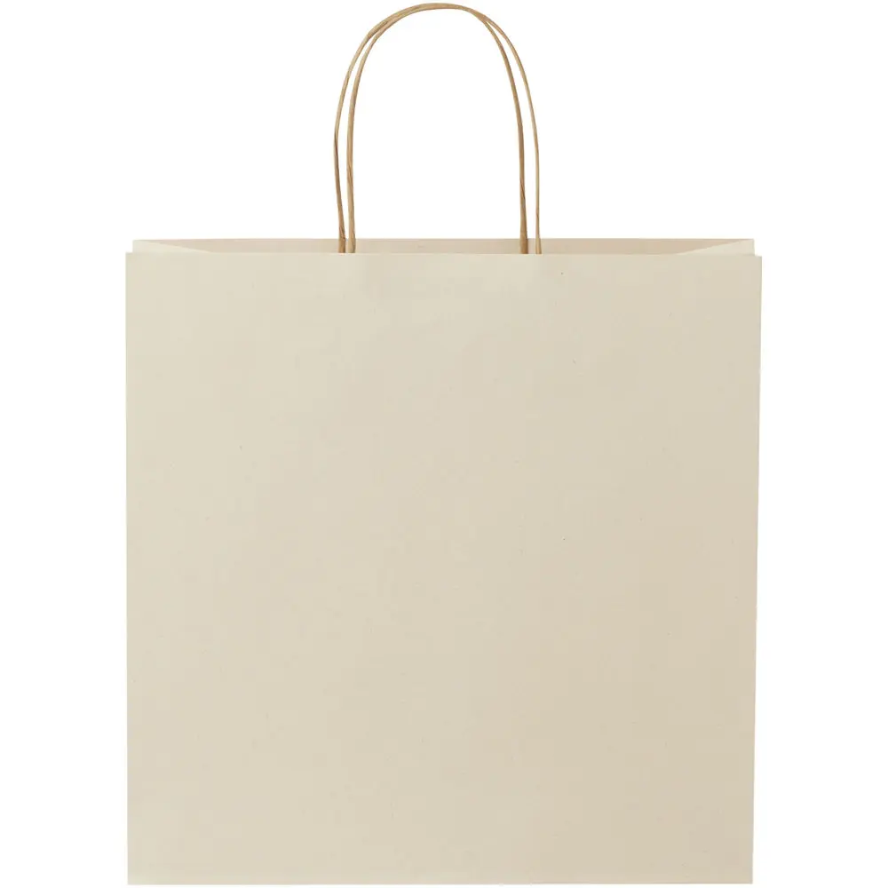 Découvrez notre sac en papier extra large fabriqué à partir de déchets agricoles recyclés, avec une densité de 150 g/m² pour une robustesse optimale. Mesurant 31 x 31 x 12 cm, il offre un espace généreux pour transporter cadeaux ou goodies lors d'événements. Les poignées torsadées en papier assurent un confort de portage supérieur.