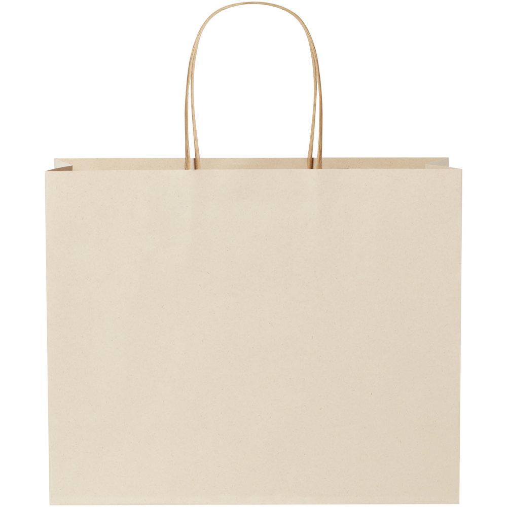 Découvrez notre grand sac en papier de 150 g/m² (31 x 12 x 25 cm), fabriqué à partir de déchets agricoles pour une approche durable et innovante. Équipé de poignées en papier torsadé résistantes, il offre une capacité généreuse idéale pour transporter des objets lors d'événements ou de distributions promotionnelles.