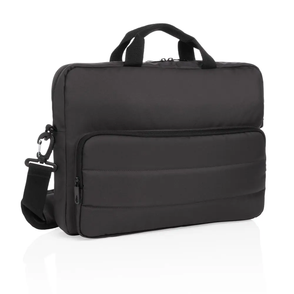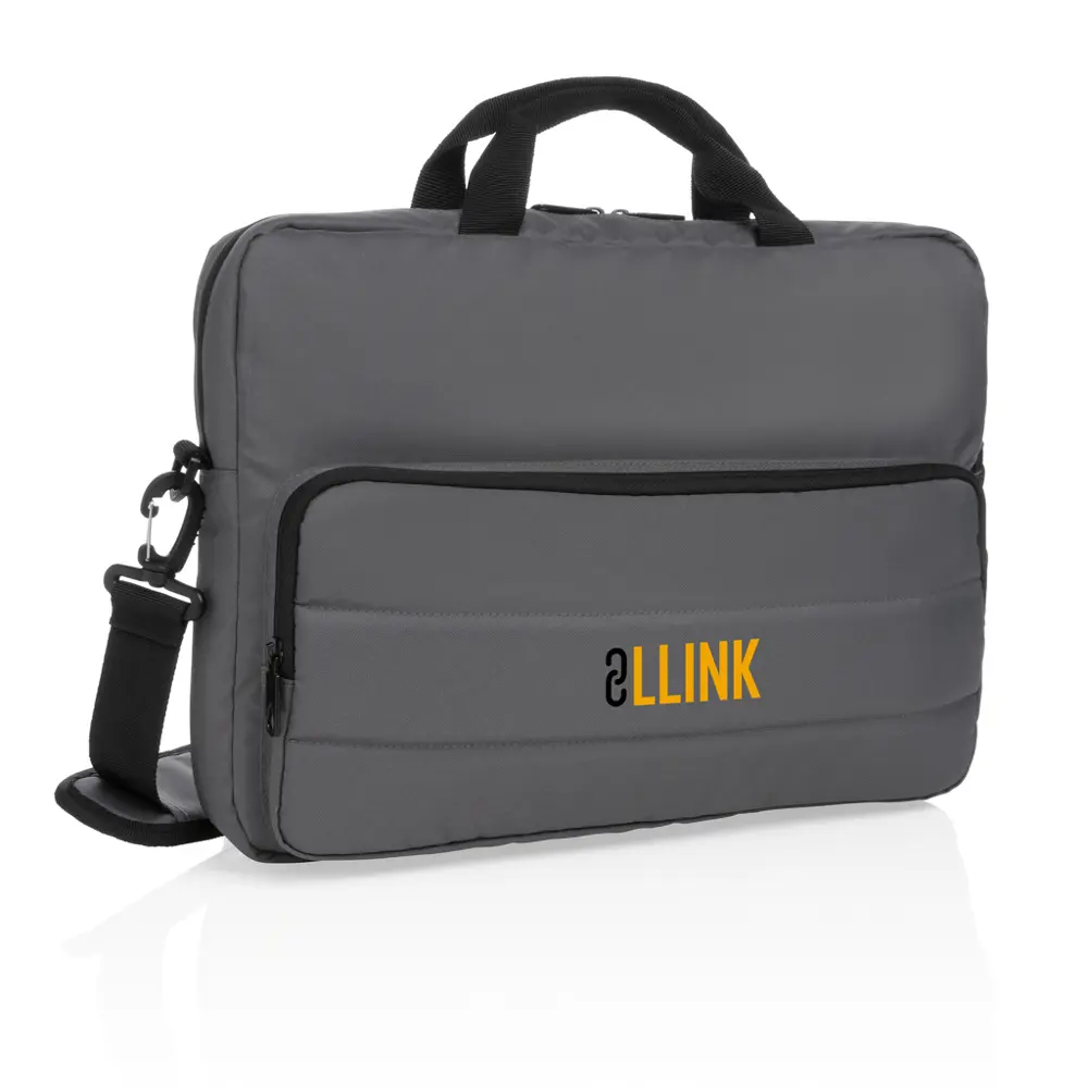 Découvrez la sacoche ordinateur Melbourne 15,6 pouces, idéale pour les professionnels en marketing et organisateurs d'événements cherchant des cadeaux d'affaires durables et personnalisables avec logo. Fabriquée en rPET AWARE™ à partir de 26 bouteilles en plastique recyclées, elle garantit une authenticité traçable et réduit la consommation d'eau de 15 litres par produit. Conforme aux normes REACH et sans PVC, cette sacoche offre des multiples poches de rangement, deux poignées supérieures et une bandoulière réglable amovible pour un transport pratique.