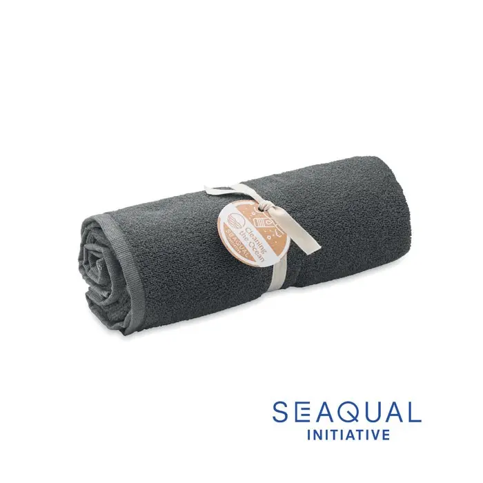 Découvrez notre serviette SEAQUAL® SAND de 70x140 cm, idéale pour vos campagnes marketing et événements. Fabriquée en jacquard avec 70 % coton recyclé et 30 % polyester recyclé SEAQUAL®, elle pèse 500 g/m² pour une absorption et une durabilité exceptionnelles. Parfaite comme cadeau relationnel personnalisé avec votre logo, elle renforce votre image de marque éco-responsable.