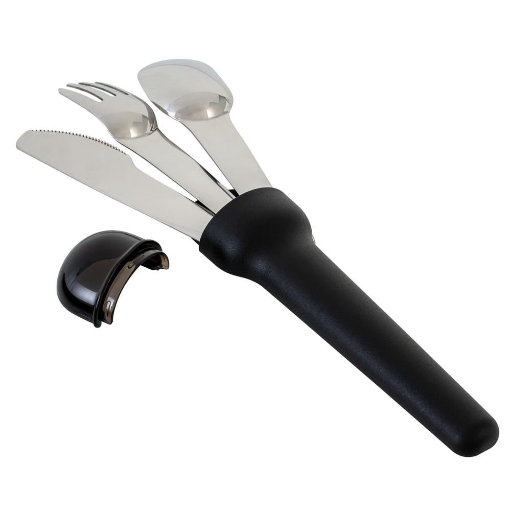 Ce set complet comprend une fourchette, une cuillère et un couteau, rangés dans une boîte de rangement pratique. Fabriqué en polycarbonate recyclé et en acier inoxydable recyclé, il allie durabilité et respect de l'environnement.