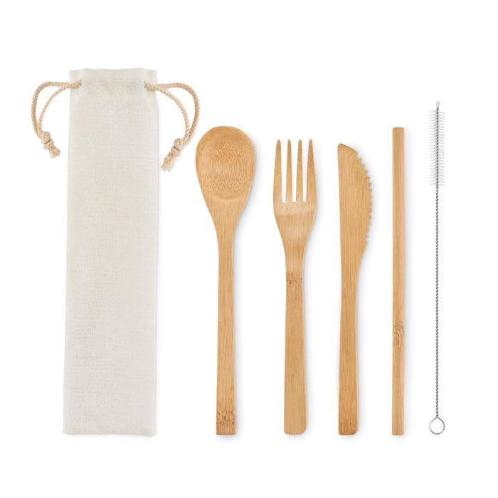 Découvrez cet ensemble de couverts en bambou réutilisables, idéal pour vos actions marketing et événements. Livré dans une pratique pochette en toile, il inclut un couteau, une fourchette, une cuillère, une paille en bambou et un écouvillon en acier inoxydable.