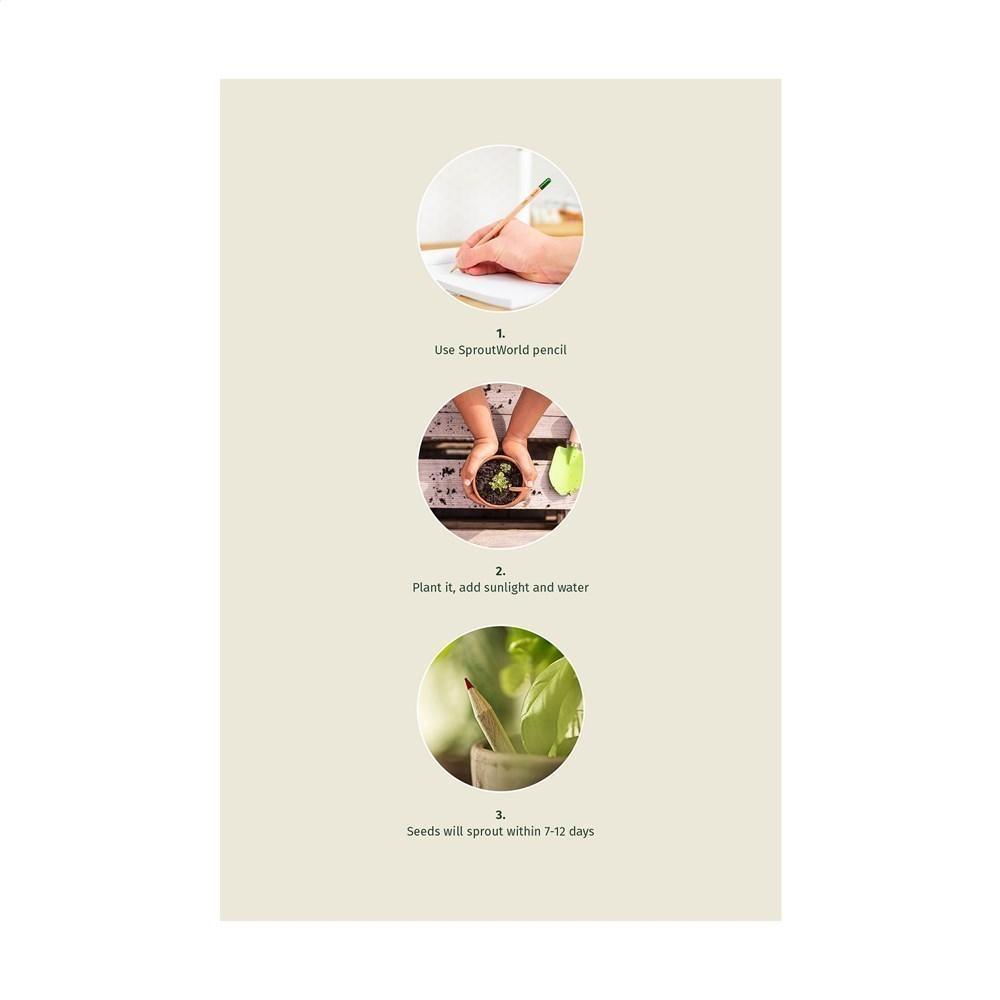 Découvrez ce crayon plantable Sproutworld à pointe aiguisée, fabriqué en bois durable. À son extrémité, une capsule en cellulose renferme des graines sélectionnées. Une fois le crayon trop court pour écrire, plantez-le en terre : en 2-3 semaines, il germe et donne naissance à de jolies fleurs, herbes aromatiques ou légumes savoureux. Le nom de la plante choisie est gravé sur le crayon pour une touche personnalisée.