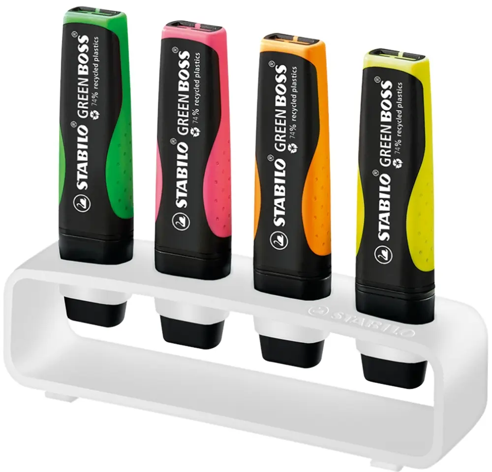 Découvrez notre set de bureau STABILO BOSS, idéal pour des cadeaux d'entreprise personnalisés et éco-responsables. Composé d'un support 100 % en plastique recyclé et de quatre surligneurs GREEN BOSS à 74 % recyclé, ce kit offre une solution durable pour marquer les esprits lors d'événements ou de campagnes marketing.