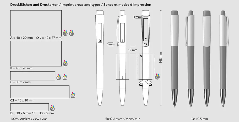 Ce stylo offre une surface idéale pour une impression de logo personnalisée, renforçant la visibilité de votre marque lors d'événements ou de campagnes publicitaires. Son design compact et sa finition high gloss confèrent une image professionnelle et premium à vos cadeaux d'affaires. Avec une mine Silktech L d'une endurance de 3 000 m (en bleu ou noir), il assure une écriture fiable et durable, idéal pour une utilisation prolongée par vos clients. Optez pour des options comme la mine Silktech XL pour une performance accrue, adaptée aux besoins intensifs.