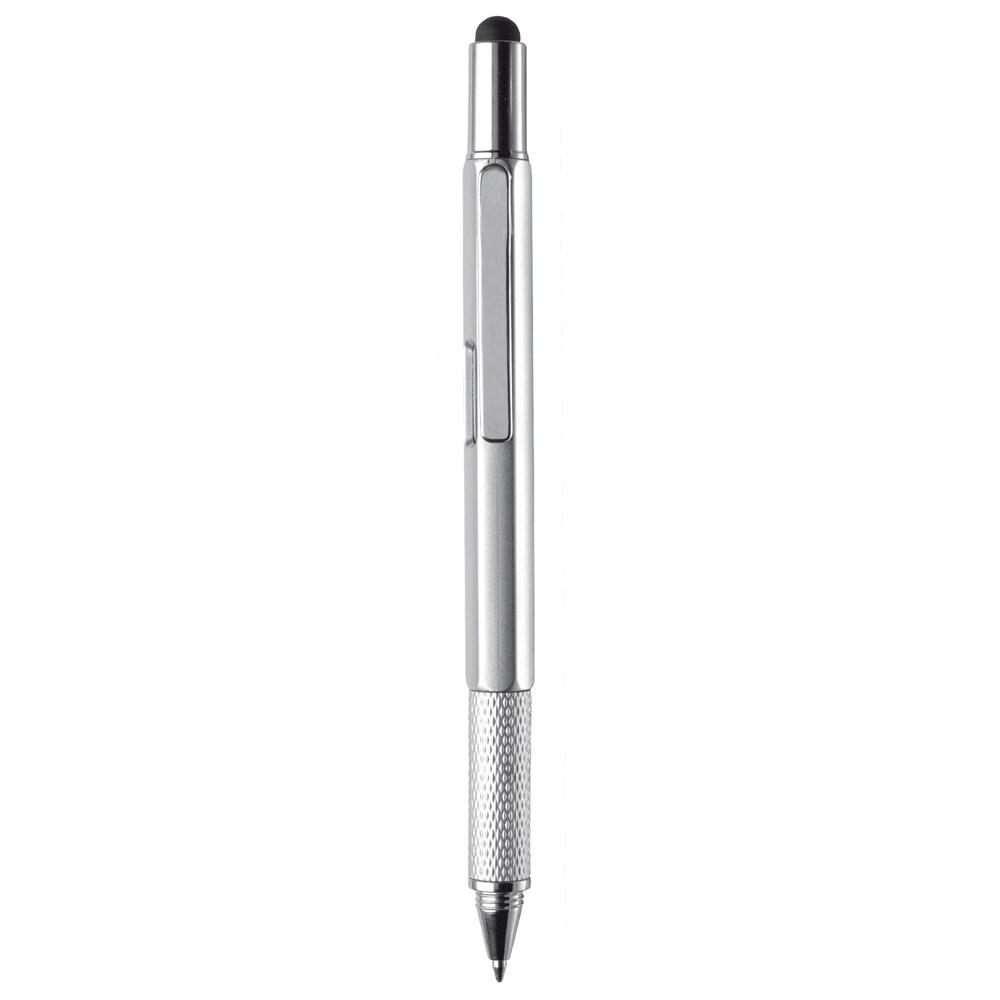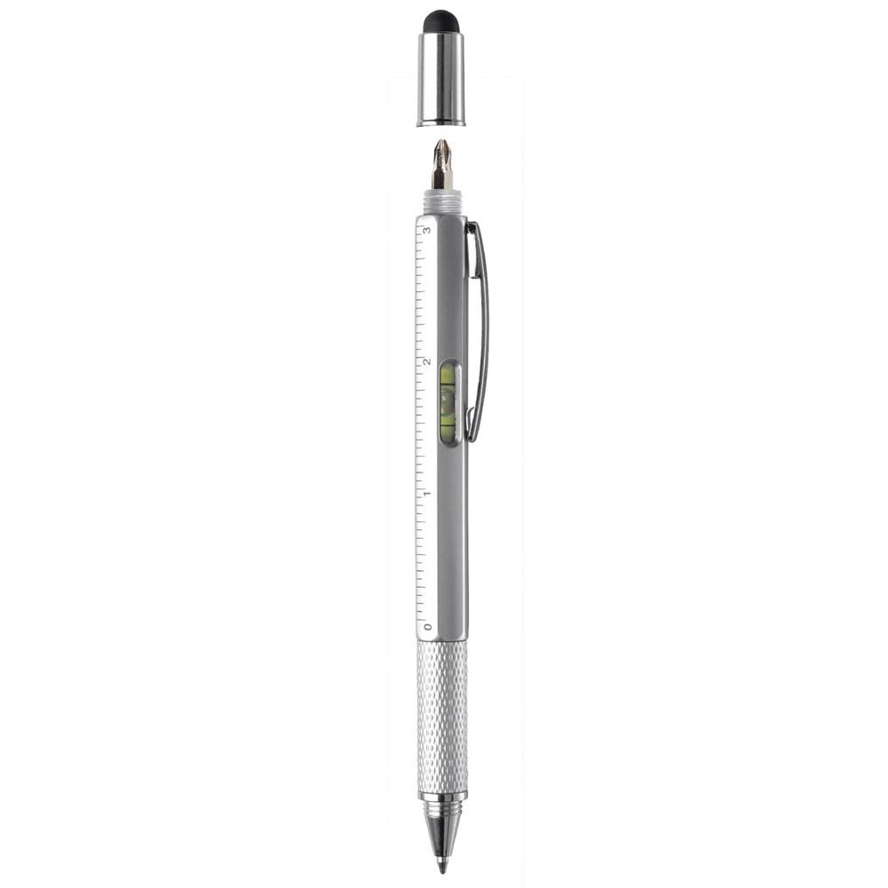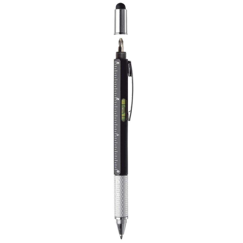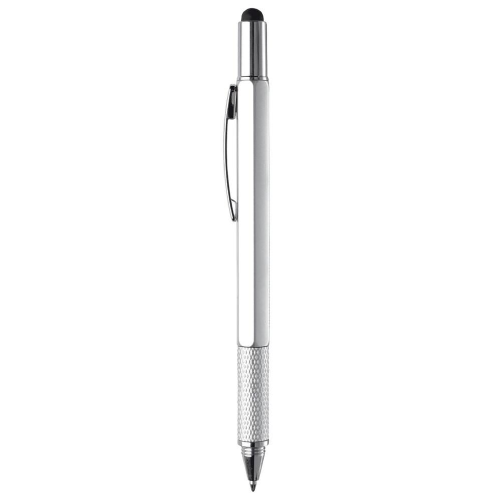 Découvrez ce stylo multifonctionnel, l'outil promotionnel parfait pour impressionner vos clients et prospects. Équipé d'une pointe bille pour écrire avec une cartouche d'encre bleue fluide, d'une pointe tactile compatible avec tous les écrans tactiles, d'un niveau à bulle précis, d'un tournevis plat pratique et d'une règle intégrée, il répond à tous les besoins quotidiens en un seul objet compact.