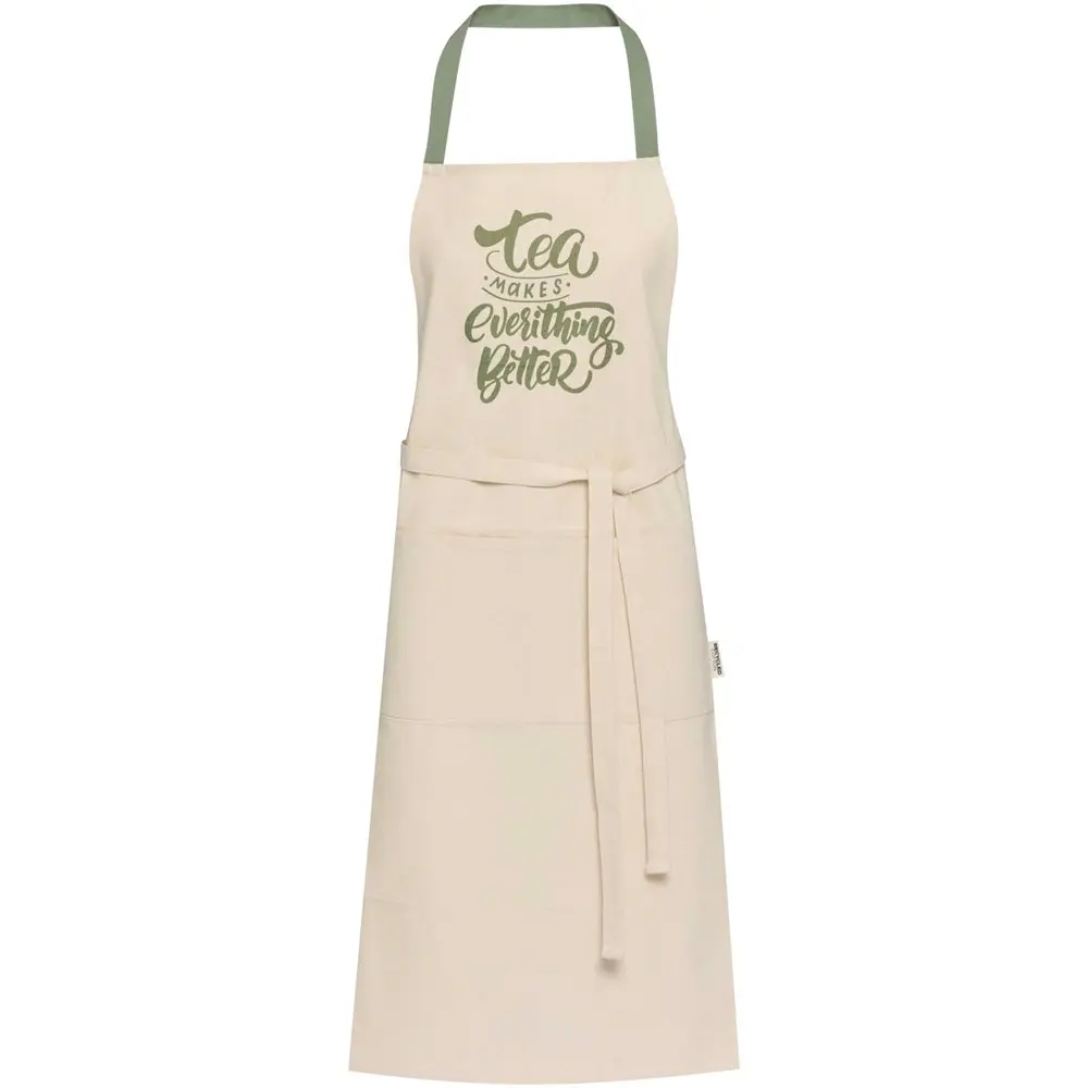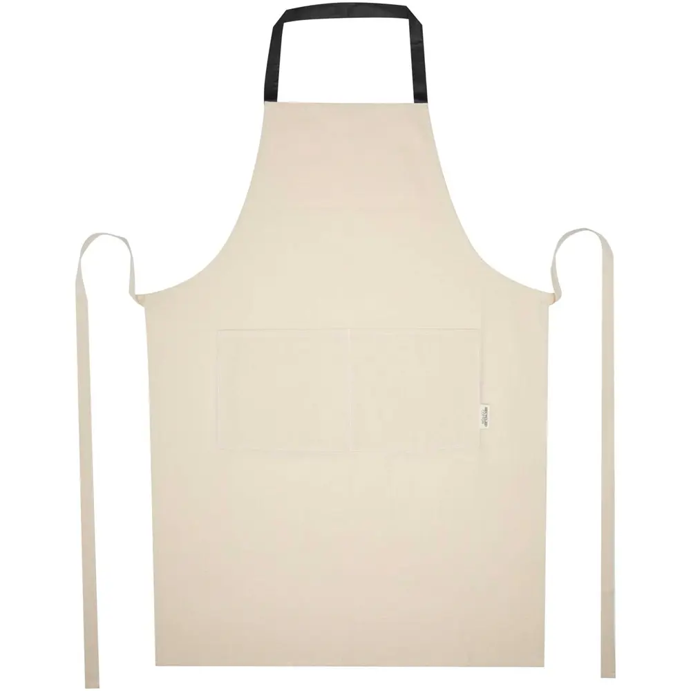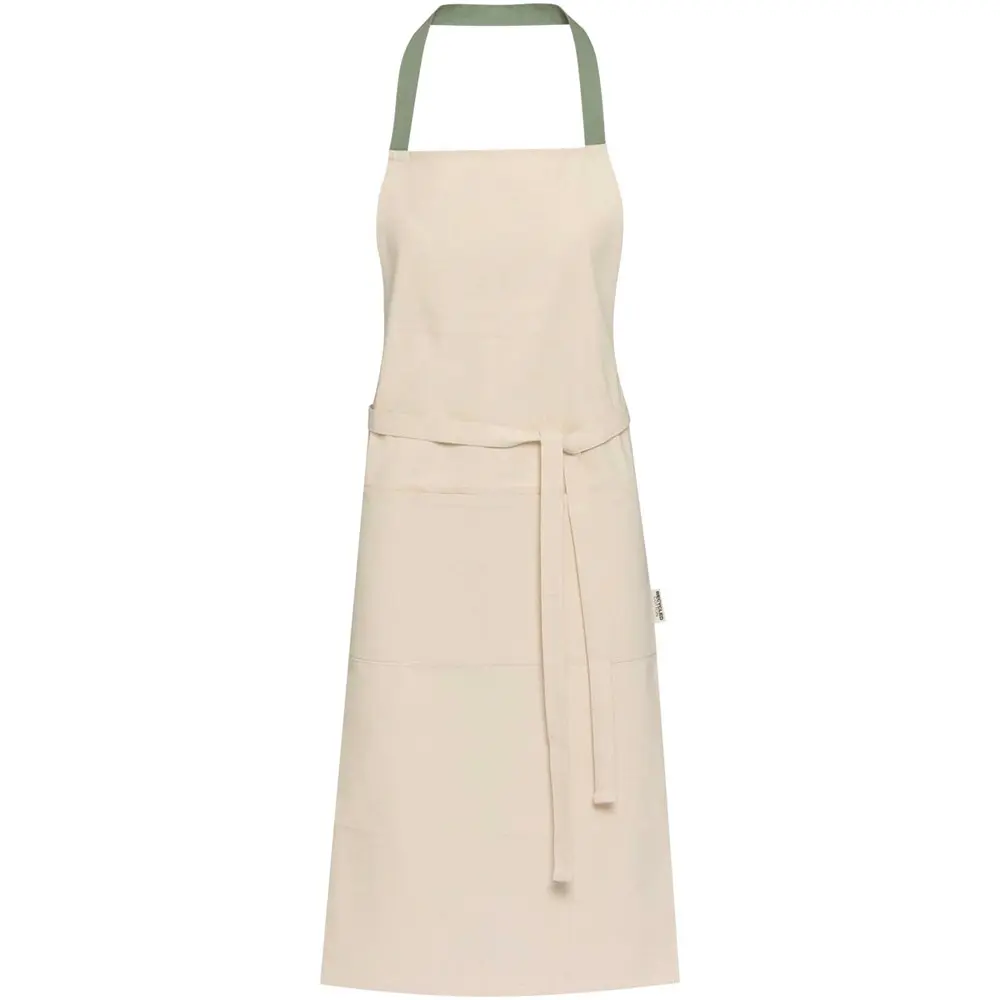Fabriqué à 100 % en coton recyclé certifié GRS de 210 g/m², ce tablier mesure 100 x 70 cm pour un ajustement confortable. Il dispose de deux poches adjacentes pour un rangement facile et d'une fermeture à nouer d'un mètre, assurant une utilisation simple et sécurisée. Sa conception robuste le rend résistant à l'usure quotidienne.