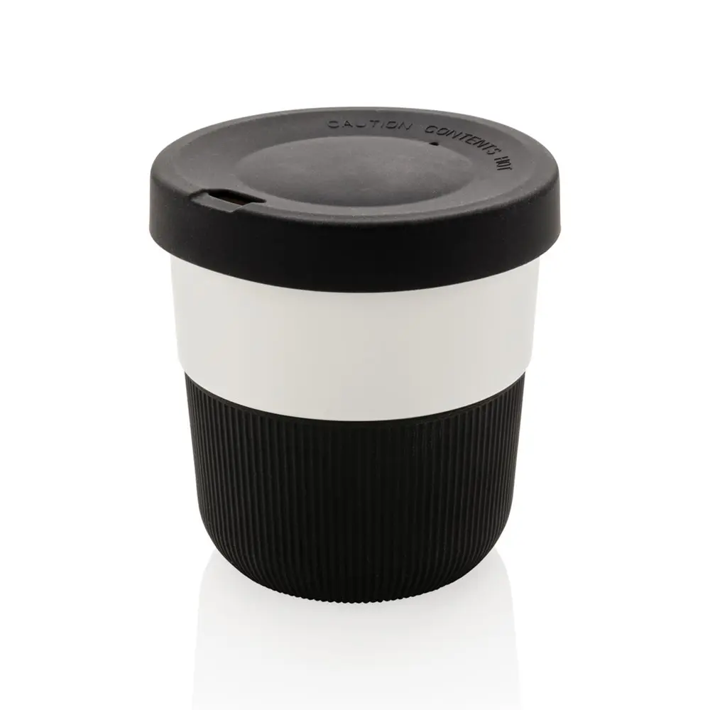 Découvrez notre tasse coffee to go de 280 ml, fabriquée en PLA 100 % végétal pour une alternative durable au plastique traditionnel. Avec un couvercle et un bandeau de protection en silicone, elle offre une prise en main confortable et une étanchéité optimale, parfaite pour les déplacements quotidiens.