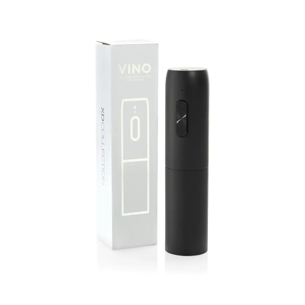 Découvrez le tire-bouchon électrique rechargeable Vino, un outil innovant idéal pour vos événements d'entreprise ou réceptions professionnelles. Avec son design élégant et compact, il ouvre sans effort les bouteilles grâce à une batterie Li-ion de 500 mAh, offrant jusqu'à 30 ouvertures par charge complète, rechargeable en 3 heures via câble USB inclus. Facile à utiliser avec un bouton simple et un voyant indicateur, il est fabriqué en ABS sans PVC, dans un emballage certifié FSC® et boîte cadeau.