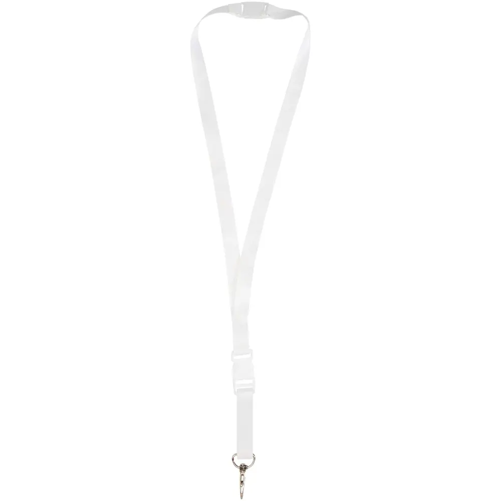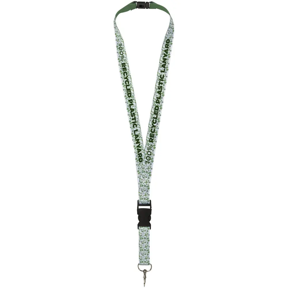 Tour de cou en PET recyclé avec marquage sur tout la surface, crochet métallique et séparateur en plastique avec fermoir de sécurité pour éliminer les risques d'étouffement. Le marquage peut être réalisé sur une ou sur les deux faces. Pour une impression sur les deux faces, vous pouvez choisir pour le marquage standard ou pour l'alignement des marquages. Permet d'accrocher un badge nominatif, une carte d'identité ou des clés. Disponible en 4 largeurs différentes : 10, 15, 20 et 25 mm.