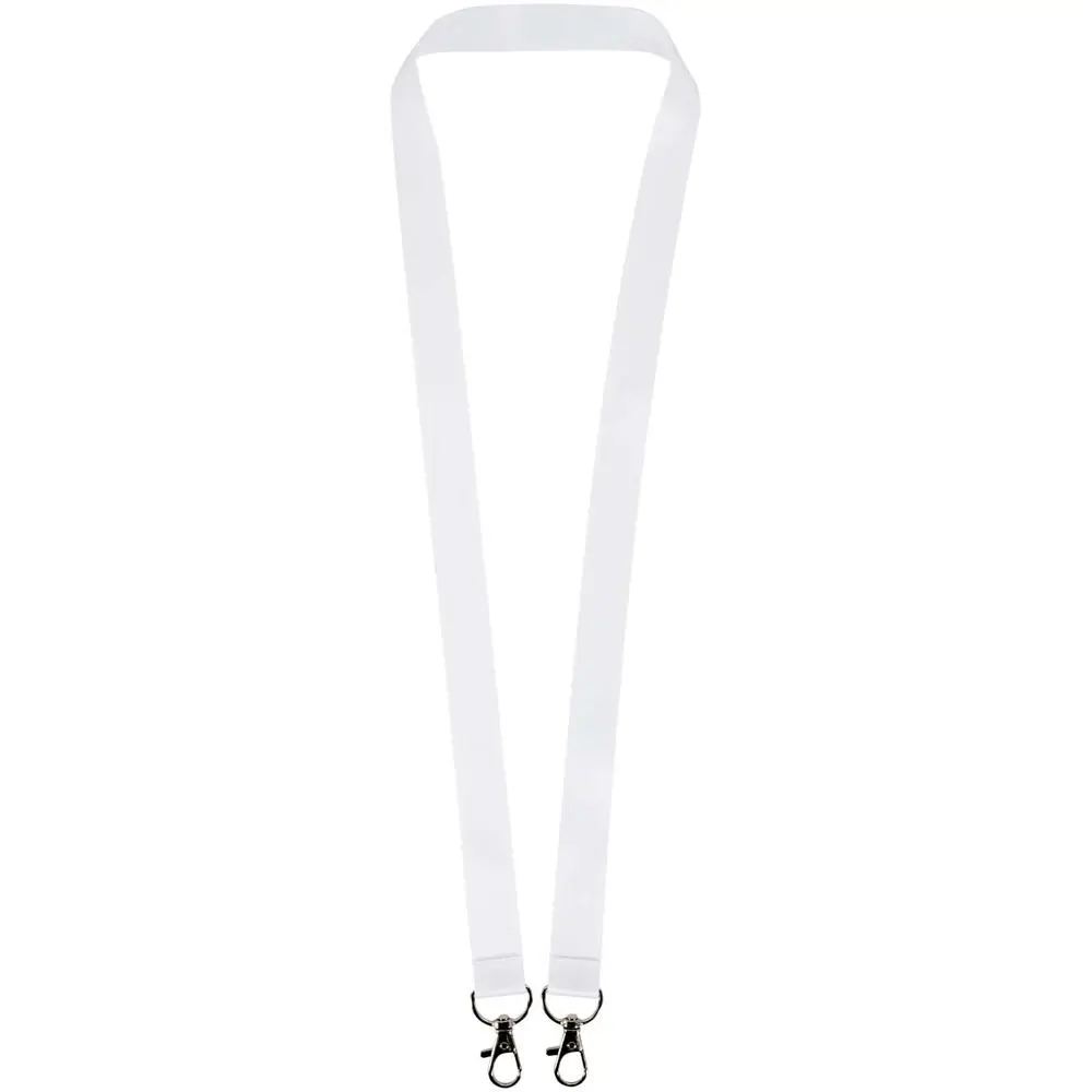 Fabriqué en polyester PET recyclé, ce tour de cou mesure 90 x 1 cm et est disponible en quatre largeurs : 10 mm, 15 mm, 20 mm et 25 mm. Il intègre une bande en rPET robuste et deux crochets métalliques pour accrocher un badge nominatif, une carte d'identité ou des clés. La matière recyclée assure une durabilité accrue sans compromettre la qualité.