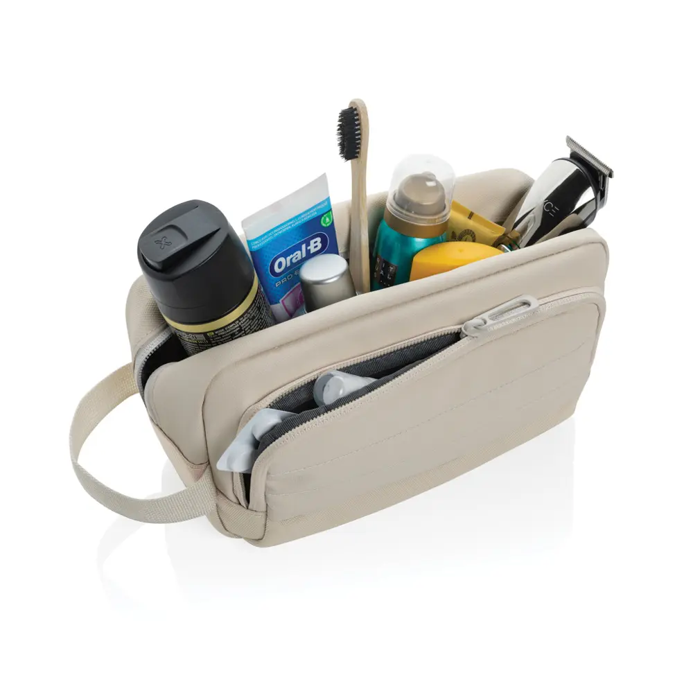 Gardez vos articles de toilette organisés avec élégance lors de vos déplacements professionnels. Cette trousse Armond offre un compartiment principal spacieux de 2,9 L pour vos essentiels, et une poche frontale zippée pour un rangement pratique des petits objets. Idéale pour les events et les cadeaux clients, elle se personalise facilement avec votre logo, renforçant votre image de marque durable.