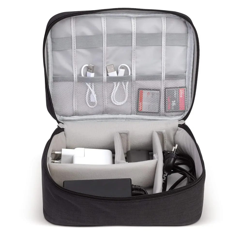 Découvrez notre trousse de voyage pour câbles et chargeurs, idéale pour organiser et protéger vos accessoires électroniques en déplacement. Conçue avec un rembourrage protecteur, elle range efficacement câbles, chargeurs, cartes mémoire et plus, évitant les enchevêtrements et les dommages. Parfaite pour les professionnels en voyage d'affaires, elle s'adapte à un usage quotidien nomade.