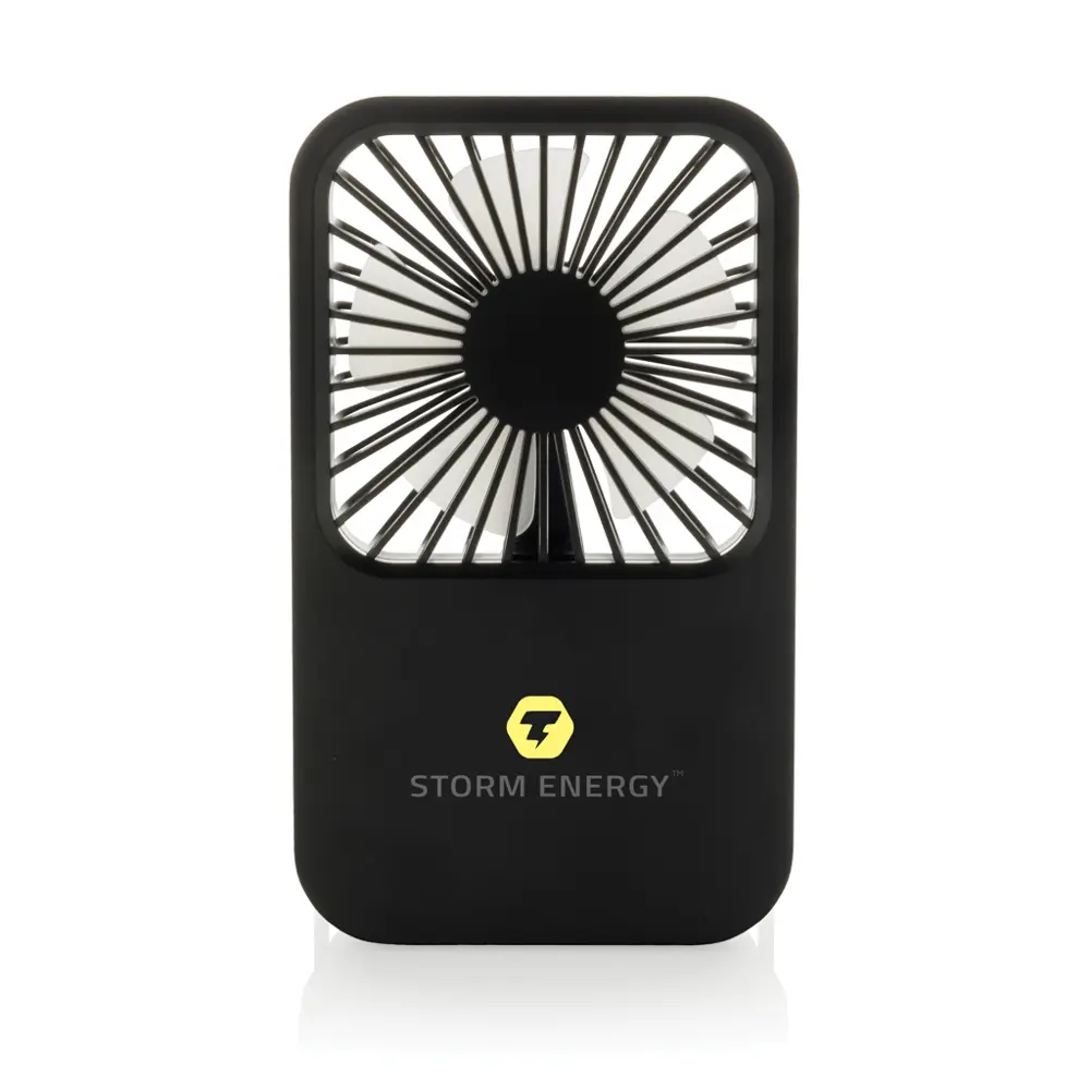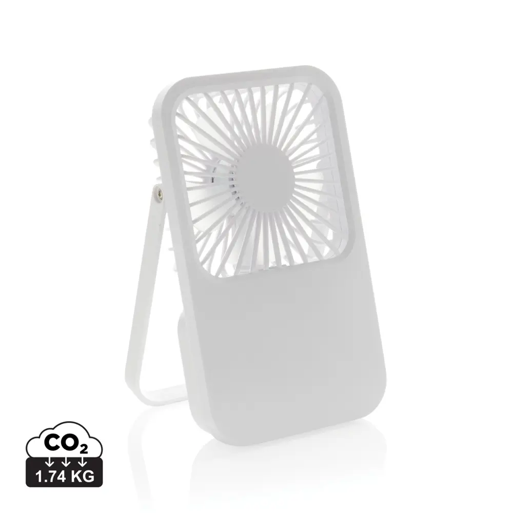 Doté d'une batterie Li-ion rechargeable de 1200 mAh pour jusqu'à 3 heures d'autonomie, il se recharge en 4 heures via USB. Avec trois niveaux de vitesse et un support ajustable, il s'adapte à tous les besoins au bureau ou en extérieur. Sans PVC, il respecte les normes environnementales strictes (REACH, RCS, FSC pour l'emballage).