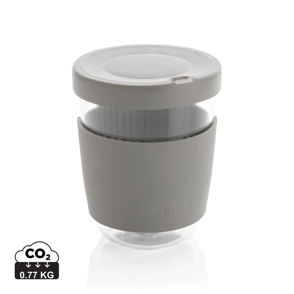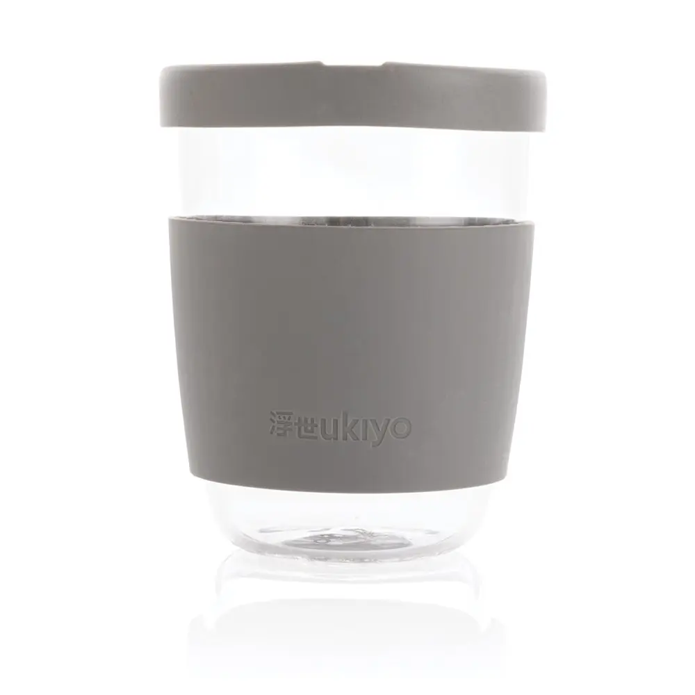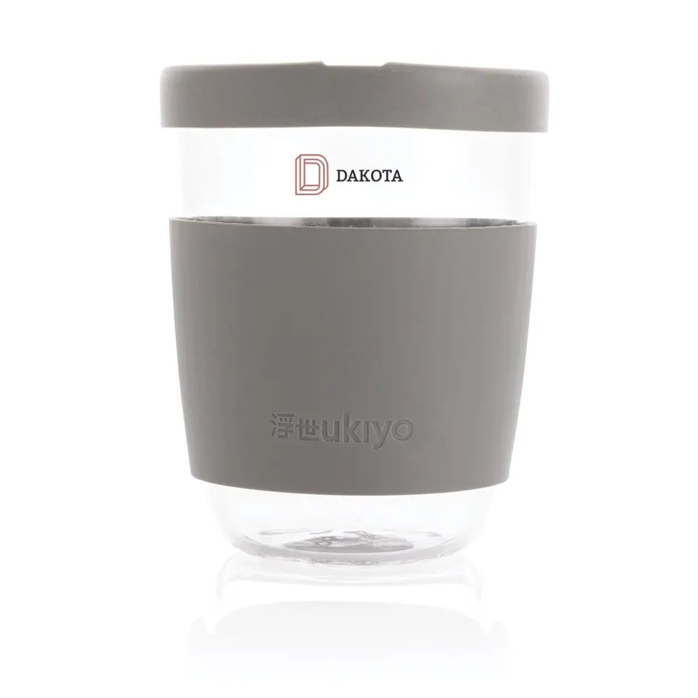 Découvrez notre verre Ukiyo de 360 ml en borosilicate, idéal pour les cadeaux d'entreprise personnalisés avec logo. Ce verre élégant est doté d'un couvercle hermétique et d'un manchon en silicone pour une prise en main confortable et une isolation thermique optimale. La petite ouverture sur le couvercle permet aux vapeurs de s'échapper, évitant l'accumulation de pression lors de boissons chaudes comme le thé ou le café.