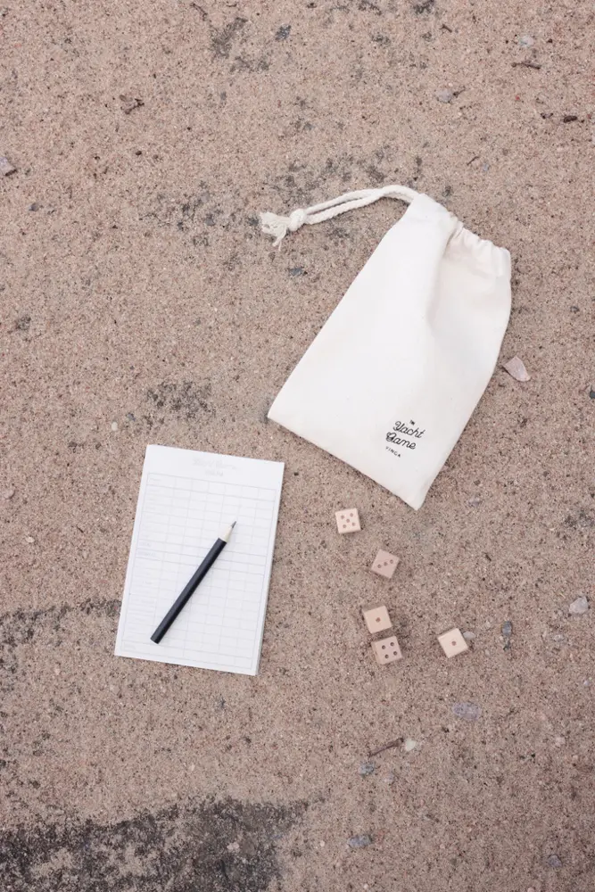 Fabriqué avec cinq dés en bois de pin FSC® certifié, un bloc-notes et un stylo pratiques, le tout rangé dans un sac en coton facile à transporter. Un manuel d'instructions clair accompagne l'ensemble pour une utilisation immédiate.