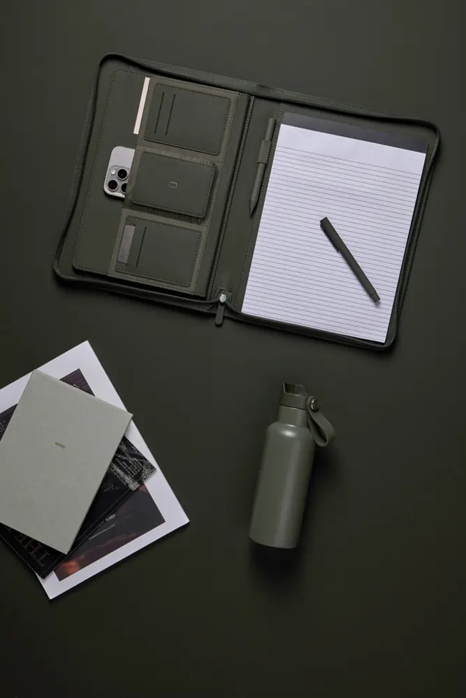 Restez organisé lors de vos déplacements professionnels avec ce porte-documents compact au format A4. Il intègre un porte-stylo pratique, une pochette dédiée aux documents, des poches élastiques pour cartes de visite et téléphone, ainsi qu'un bloc-notes ligné de 20 pages remplaçable. Conçu en polyester partiellement recyclé avec un revêtement en PU mat durable, il offre une solution élégante pour le bureau ou les voyages d'affaires.