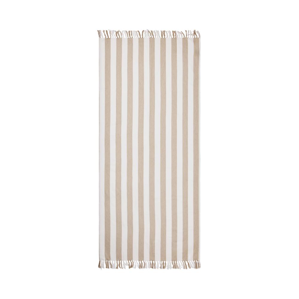 Découvrez cette serviette de plage hammam au motif classique à rayures bicolores et franges élégantes sur les petits côtés. Fabriquée en mélange léger de 200 g/m² (68 % coton recyclé GRS et 29 % polyester recyclé GRS), elle offre un confort optimal grâce au coton tout en séchant rapidement grâce au polyester.