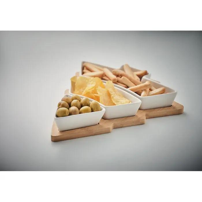 Découvrez le plat de service de Noël VIRAM, un accessoire festif idéal pour vos événements d'entreprise. Fabriqué en bambou naturel avec trois compartiments en porcelaine céramique, il adopte une forme de sapin élégante et écologique. Parfait pour servir apéritifs, desserts ou amuse-bouches lors de vos soirées corporate.