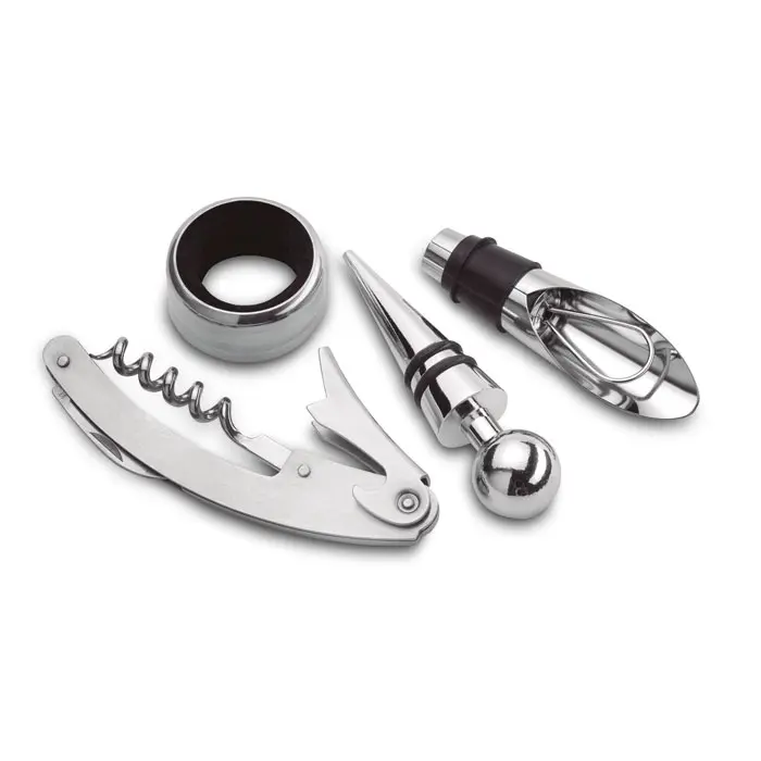 Découvrez le WINORY - Set d'accessoires à vin, un ensemble premium de 4 pièces en acier inoxydable : tire-bouchon ergonomique, bouchon hermétique, bec verseur précis et anneau anti-gouttes élégant. Présenté dans une boîte robuste, ce kit est idéal pour personnaliser avec votre logo, renforçant votre image de marque auprès de vos clients.