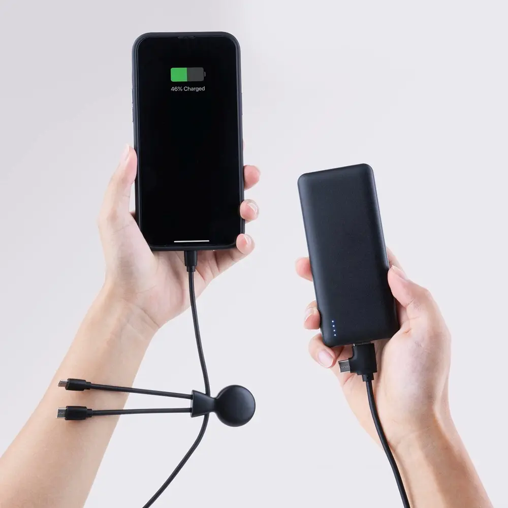 Découvrez le set Xoopar Mr. Bio : une batterie portable de 7000 mAh idéale pour charger votre smartphone jusqu'à 2,5 fois, accompagnée d'un câble de recharge long polyvalent avec connecteurs USB, Lightning, Type C et Micro USB. Fabriqués en plastique recyclé, ces accessoires durables respectent les normes Amfori BSCI, alliant écologie et praticité.