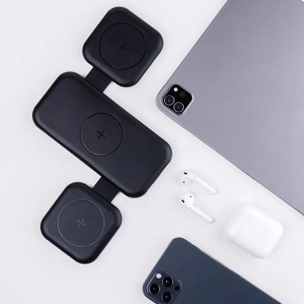 Découvrez le triple chargeur sans fil Trafold 15W, idéal pour les professionnels du marketing et les organisateurs d'événements. Chargez simultanément jusqu'à trois appareils sans fil (1x15W et 2x10W) plus un via USB (10W), pour une efficacité optimale lors de vos journées chargées. Sa conception pliable et magnétique assure une portabilité parfaite, facile à emporter pour vos événements ou déplacements professionnels.