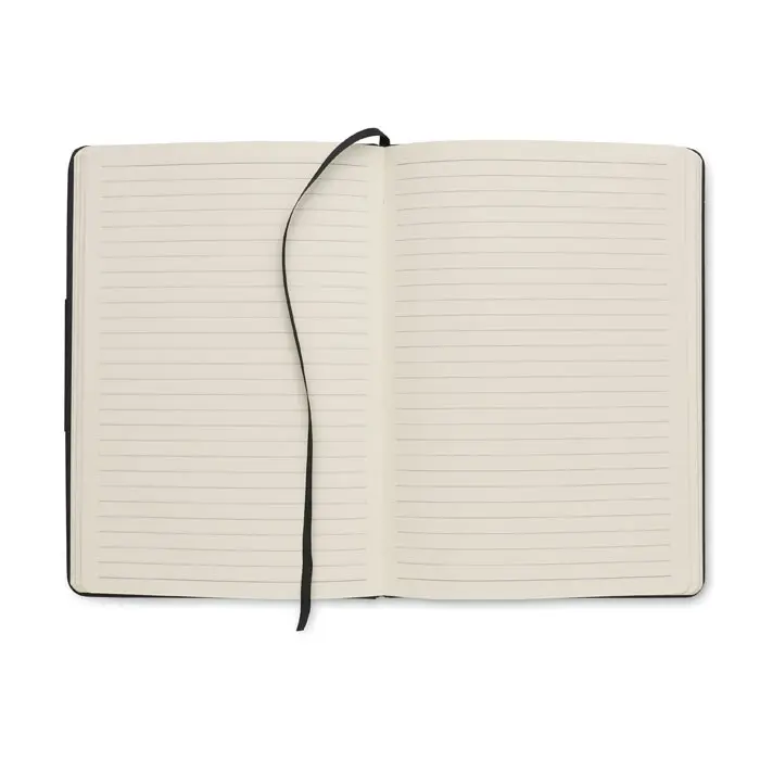 - Un carnet A5 à couverture rigide en RPET, avec 160 pages lignées en papier recyclé (80 feuilles). Équipé d'une fermeture élastique assortie, d'un ruban marque-page et d'un porte-stylo intégré.